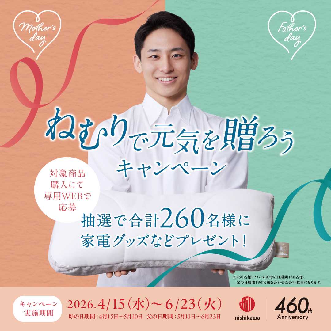 まくらを贈ろう!キャンペーン # まくらを贈ろう!キャンペーン4月25日(金)~6月15日(日)対象商品のnishikawaのまくらをお買い上げ頂き、ご応募頂いた方の中から抽... -