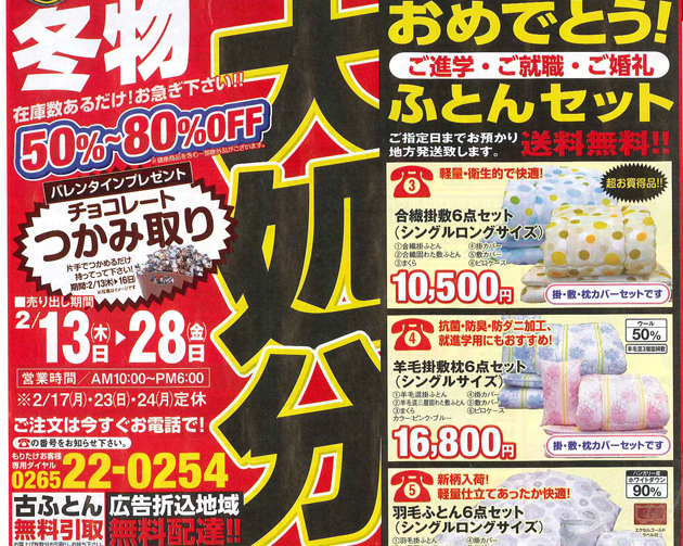 いや~参りましたねぇ(-_-) 寝具の番人もりたけです。 飯田地方では観測史上最高の積雪でなんと81cmとか・・・・ 当店13日より冬物処分セールだったのですが(28日まで開... -
