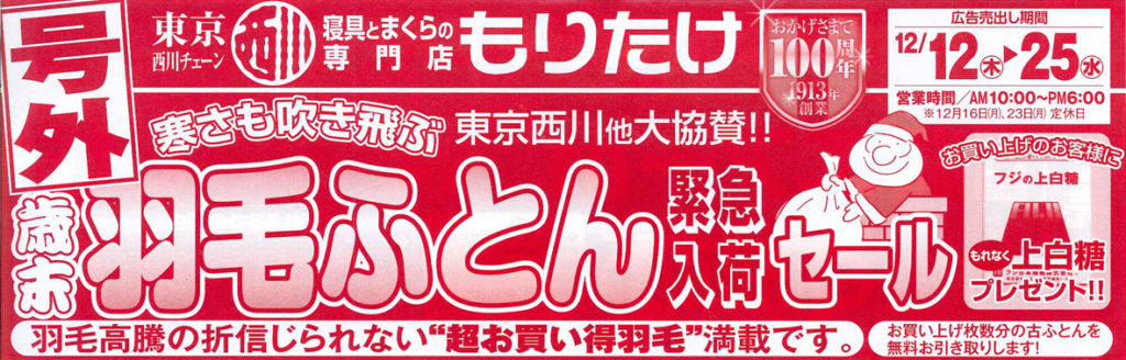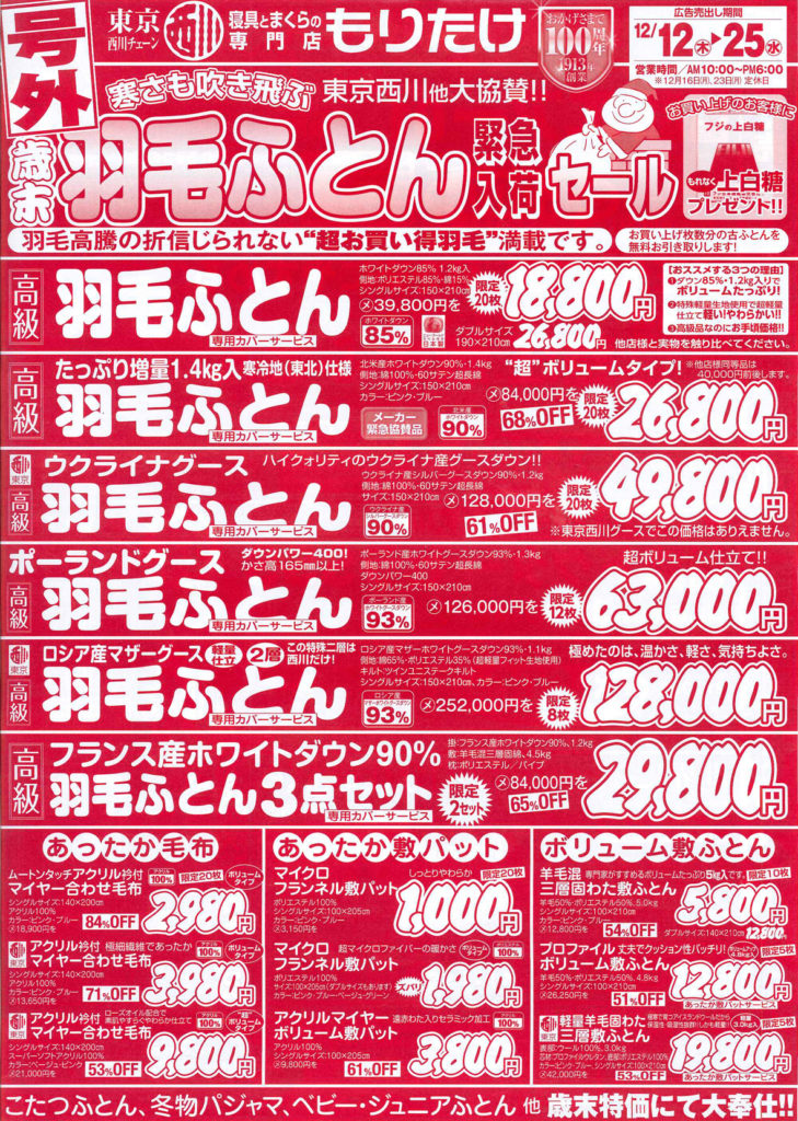 羽毛ふとん高騰の折メーカー協賛にて「羽毛ふとんお買い得セール」を開催します。 高品質でリーズナブルな羽毛ふとん他、冬物寝具をたっぷりご用意しております。 詳し... -
