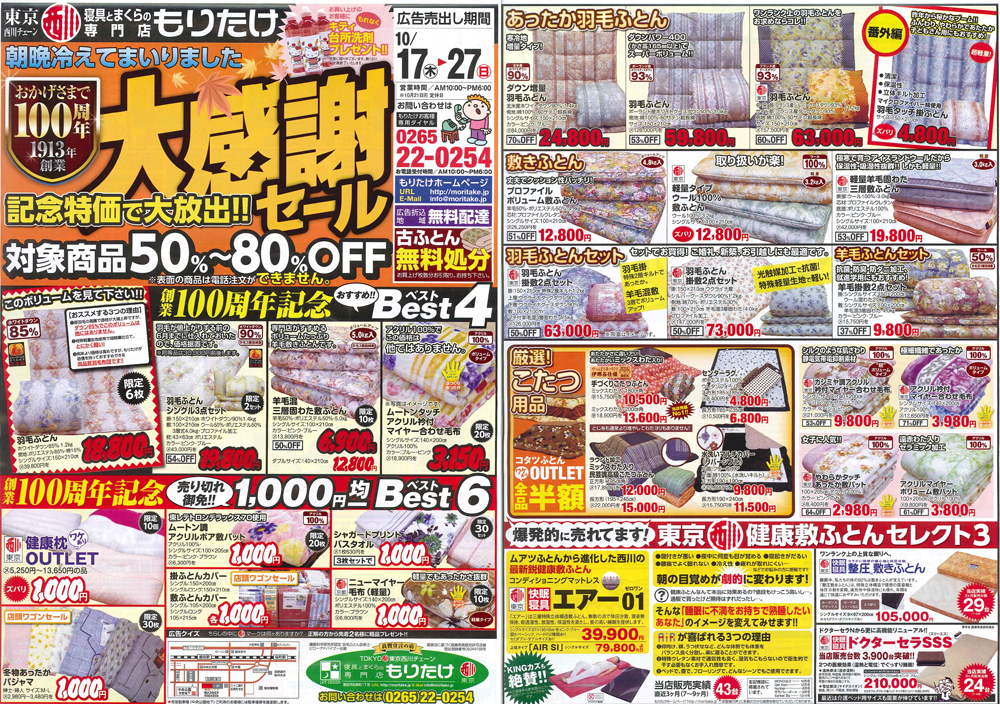 ★朝晩とめっきり寒くなってきましたね。こうなるとふとん屋さんの本格始動の時期です(^^) そして今年はなんと「もりたけ創業100周年」の節目の年! ということで大感謝...