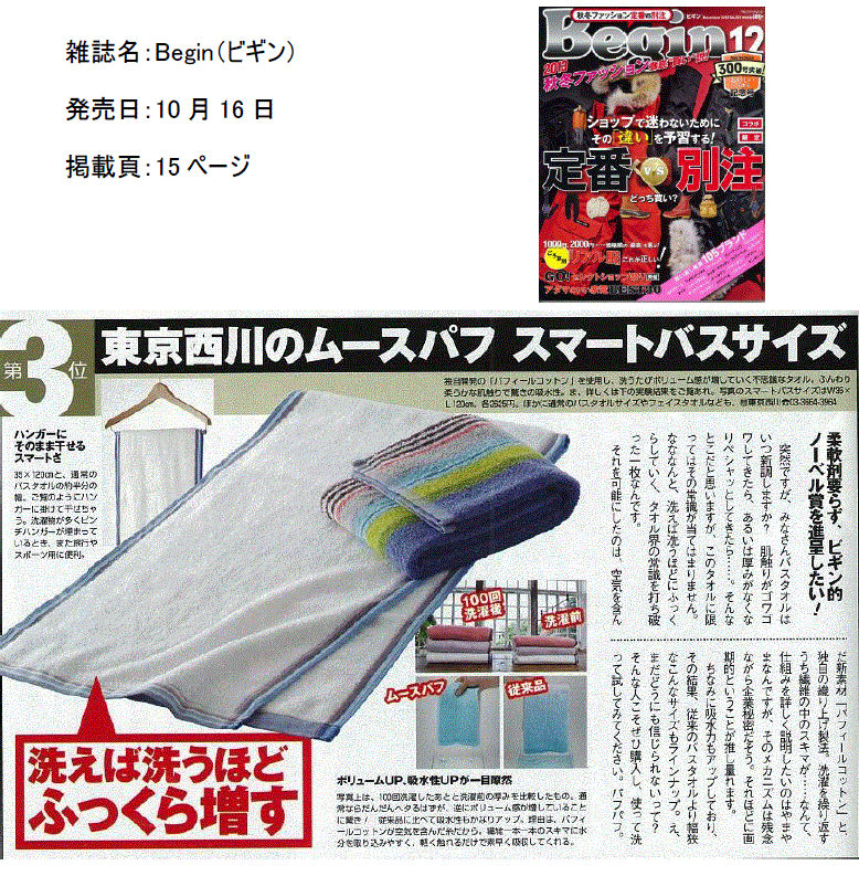 洗うほどふっくら増すバスタオルが雑誌「Begin(12月号)」で掲載!