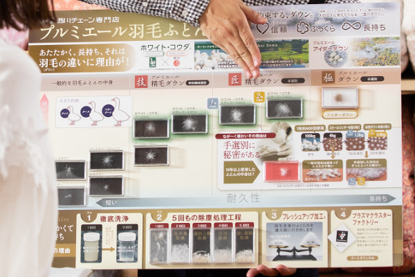 その中でも特におすすめしたいのが、下伊那地域では当店でしか手に入らない「西川チェーン専門店オリジナル羽毛ふとん」です。こちらは、デパートや一般的なお店に並ぶ西川製品とは、仕立てや品質の基準が異なります。
