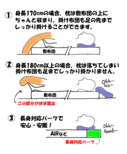 解決策は簡単!!長いおふとんを仕立てればいいんです(ちょっとコストはかかりますけど・・」