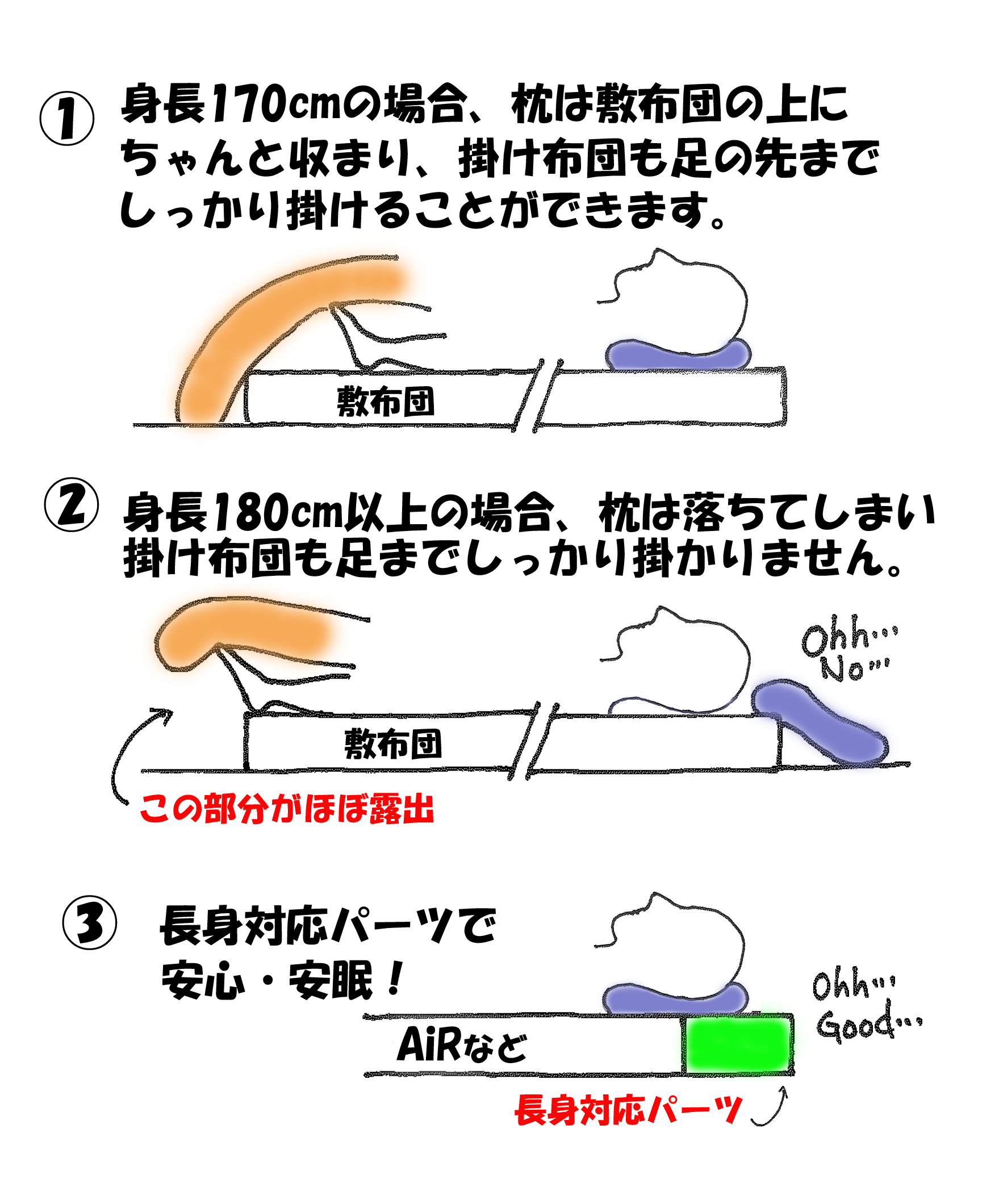 身長180cmを超える方が一般的な長さ200cmの敷布団で寝ると、枕が布団から落ちてしまい(図②)夜中に何度も枕を探す羽目になり熟睡の妨げにもなります。(長身の方あるある)