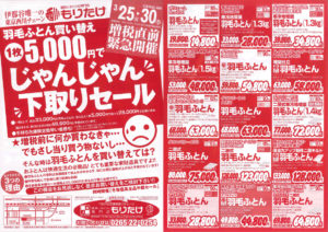 「羽毛ふとんお買い換え・古ふとん1枚5,000円でじゃんじゃん下取りセール」を開催します。