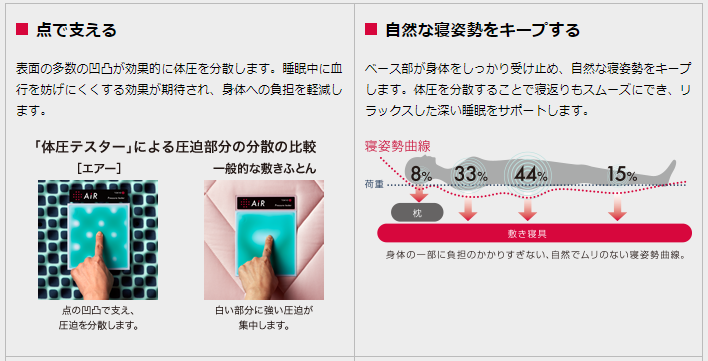 ここで東京西川の健康マット”エアーシリーズ”や”整圧敷きふとん”を引き合いに出しますが、西川の健康マットのプロダトコンセプトは”就寝中のカラダを無数の点で支えることで体圧を分散し理想的な寝姿勢を追求する”ことです。点の数が多いほどムラ無く体圧分散する効果が高まります。