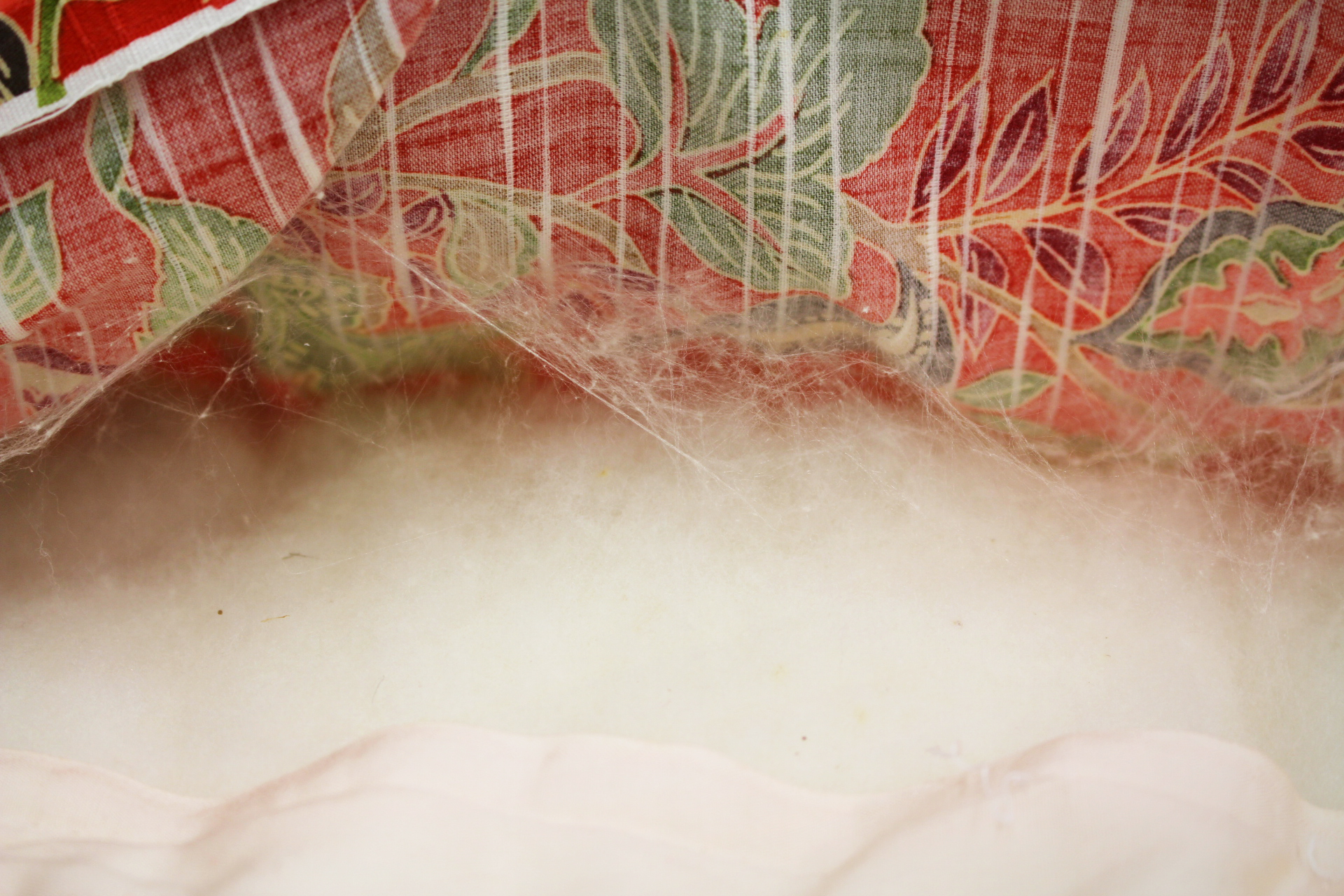 また、仕立ての最後に綿切れや綿寄りを防ぐために真綿(※蚕の繭から作る”わた”=シルク)を挽いて覆うのですが、これが実に丁寧に何層にも施され(見た感じの推測です)、表生地に張り付いて布団わたと生地をしっかりと密着させる当時の高い技術がうかがえます。※写真3