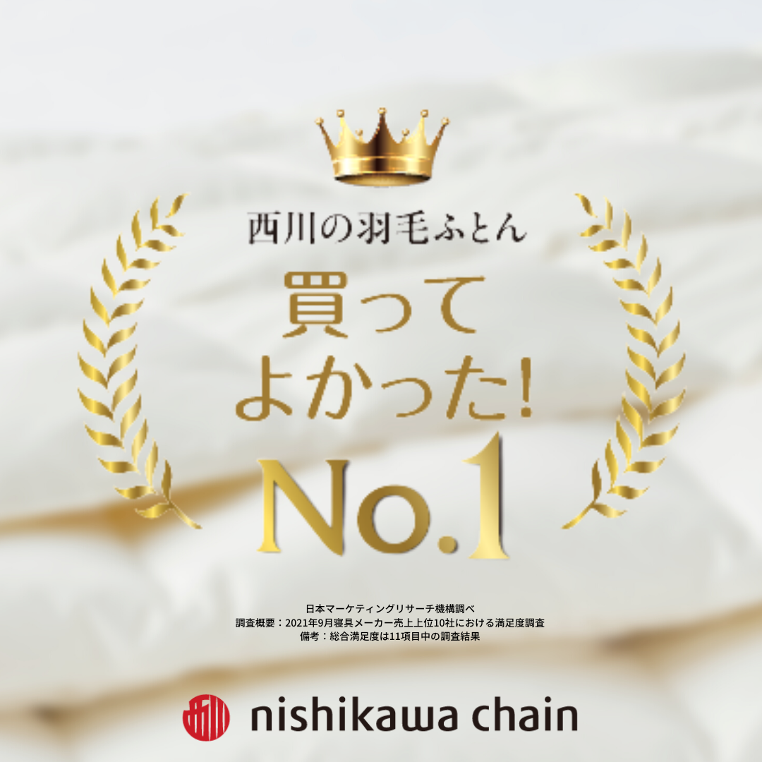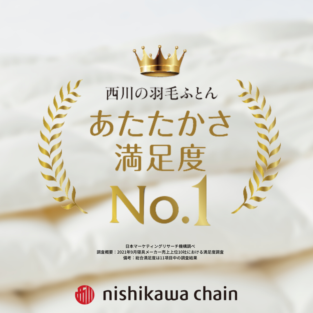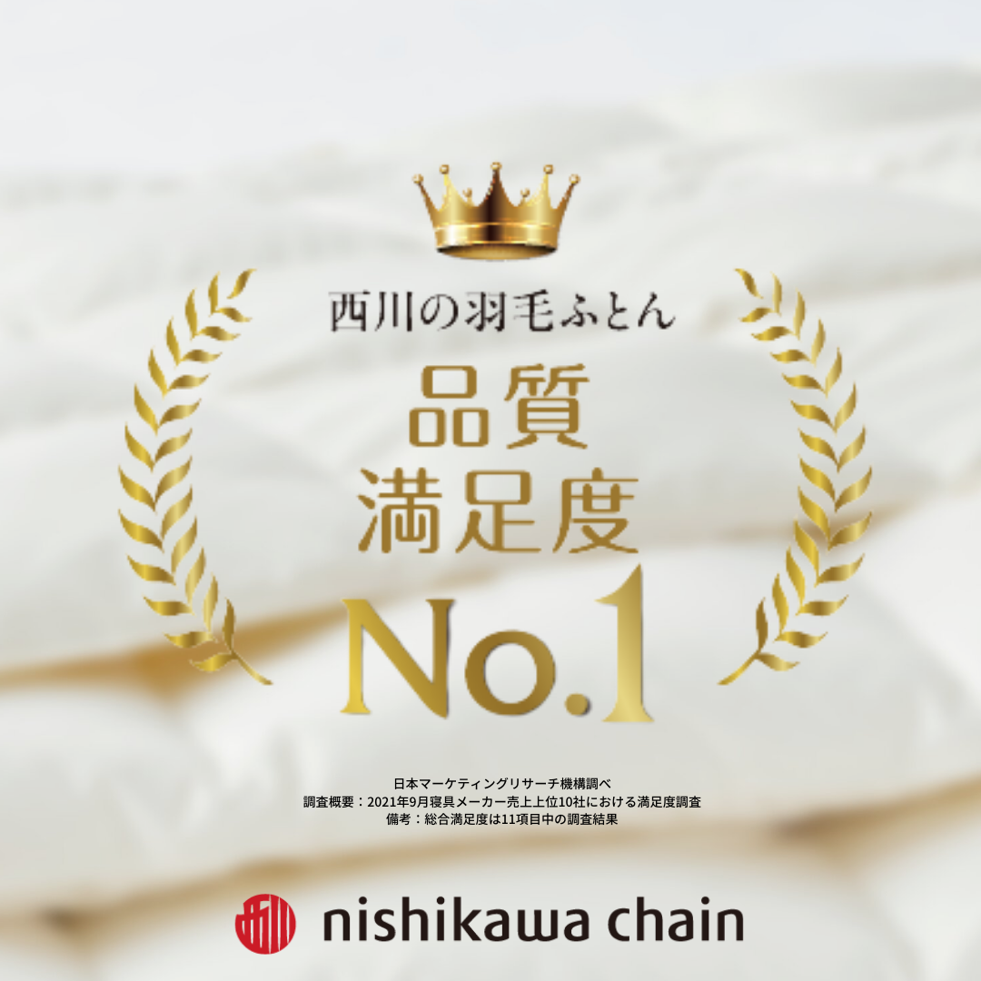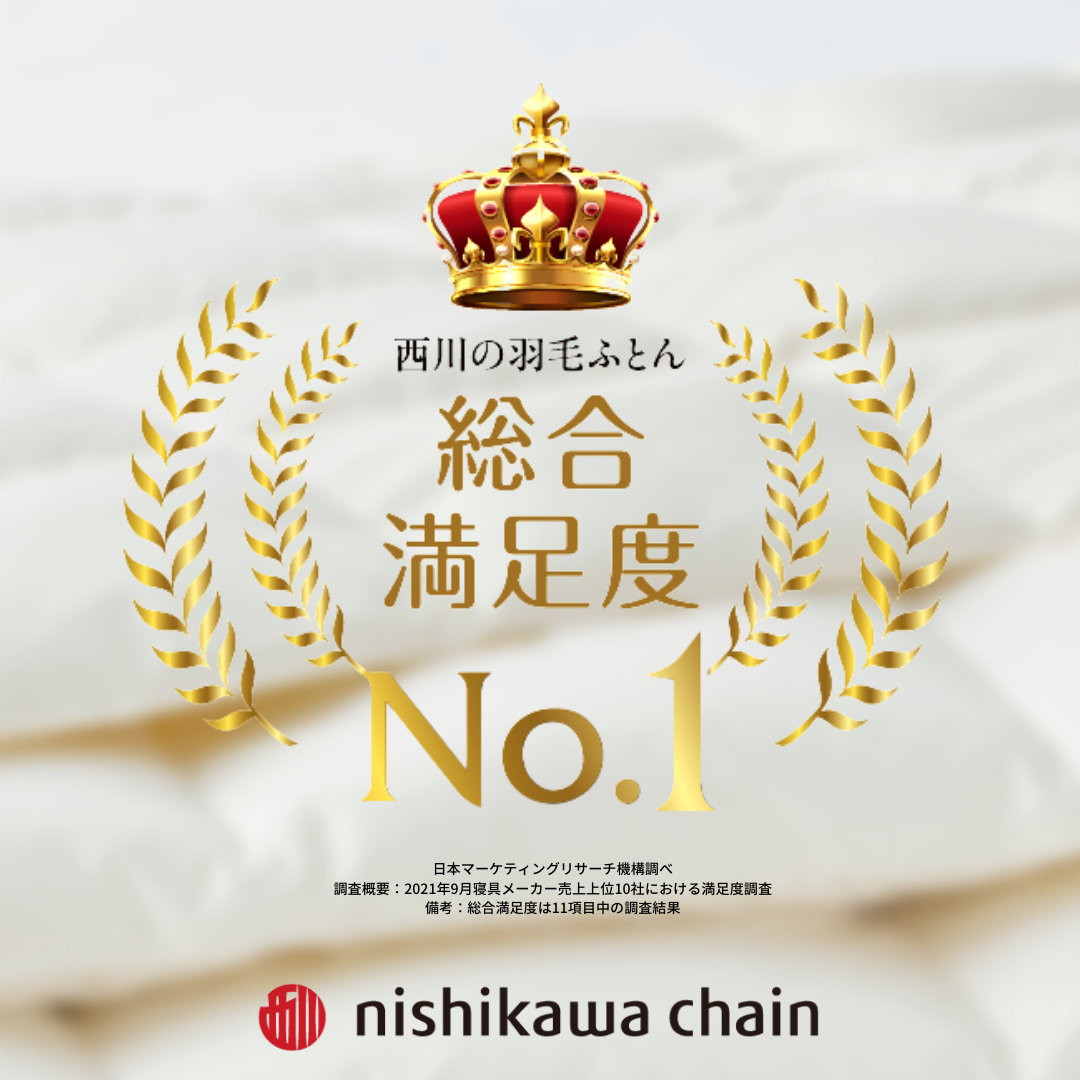 日本マーケティングリサーチ機構の基準により競合を選定した、寝具メーカー売上上位10社の商品購入者に対するWEBアンケート調査で、西川の羽毛ふとん‘総合満足度第1位!を獲得しました。