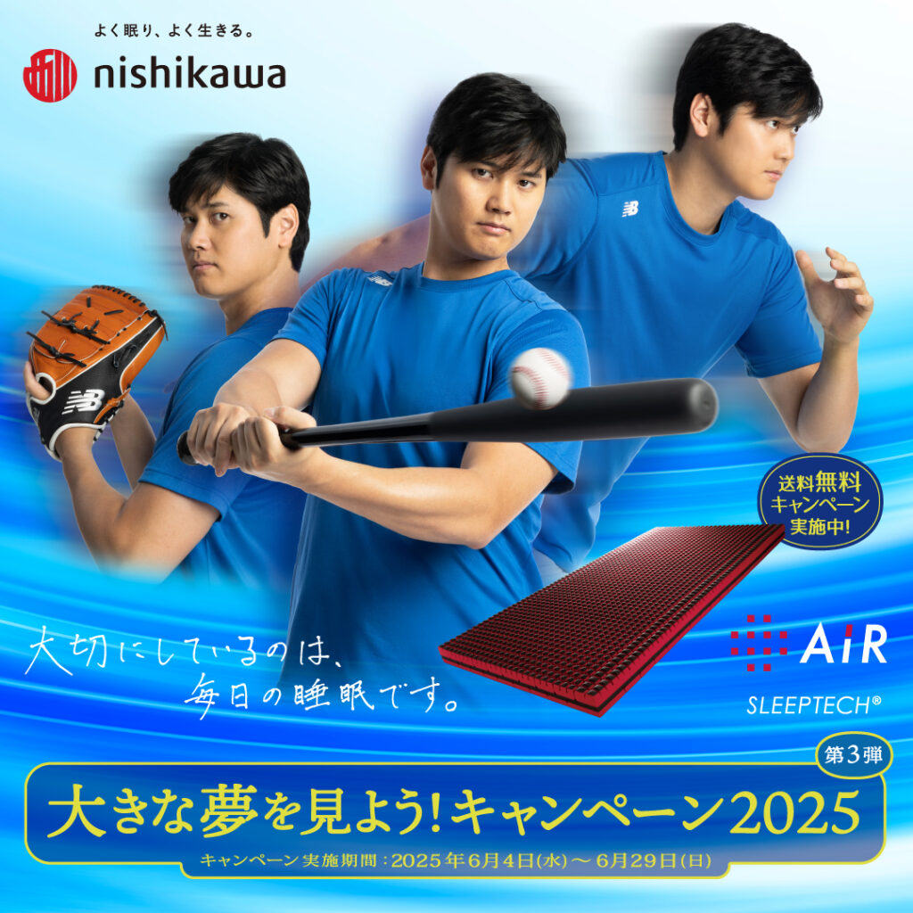 大きな夢を見よう! キャンペーン2025[期間]3月13日(木) ~4月6日(日)[エアー]マットレスご購入で#大谷翔平選手 オリジナルグッズまたはnishikawaタオルが抽選で100名様に... -