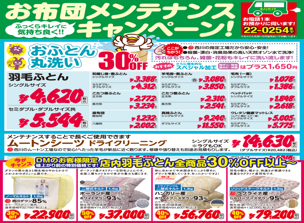 好評につき期間延長「おふとんメンテナンスキャンペーン」開催です! 8月13日(日)まで!