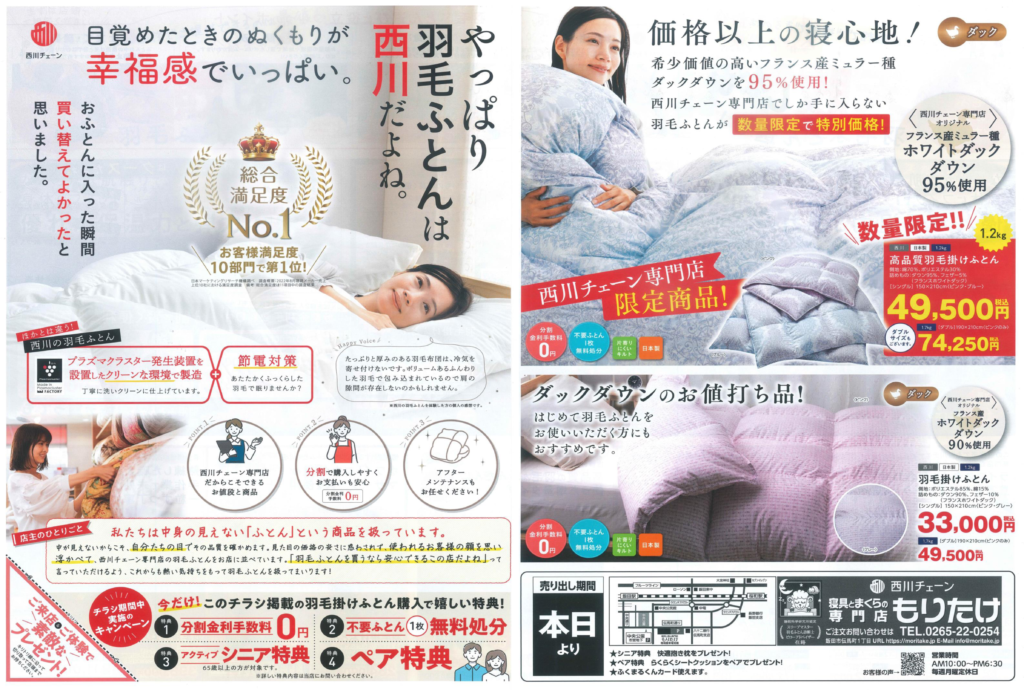 「やっぱり羽毛ふとんは西川だよね!」セール開催中! 特典満載で皆様のお越しをお待ちいております