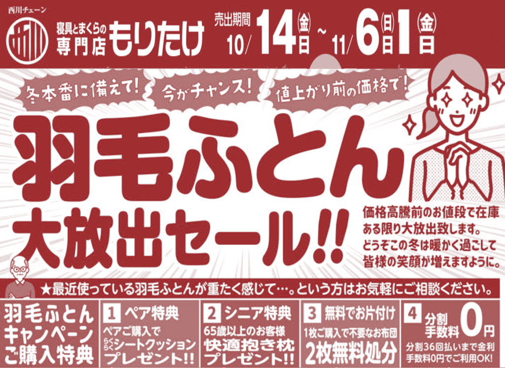 「羽毛ふとん大放出セール」開催中! 値上が前の価格でお得です!! 期間11月6日(日)まで