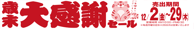今年も残り1ヶ月となりました。皆様のおかげをもちまして令和4年を無事終えることが出来そうです。そこで感謝の気持ちを込めて「歳末大感謝セール」を開催いたします。... -