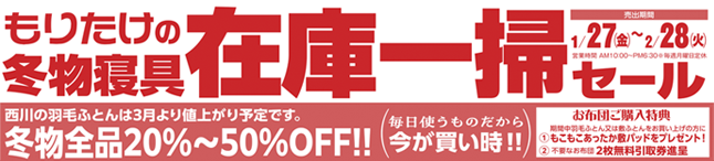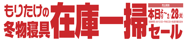 もりたけの「冬物寝具在庫一掃セール」開催です! 冬物全品20~50%OFF!! セール期間1/27(金)~2/28(水) 今後値上がり予定商品など今が買い時です