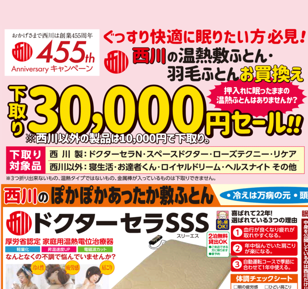 西川の温熱敷ふとん・羽毛ふとん、お買い替え30,000円下取りセール! 期間3/19(金)より