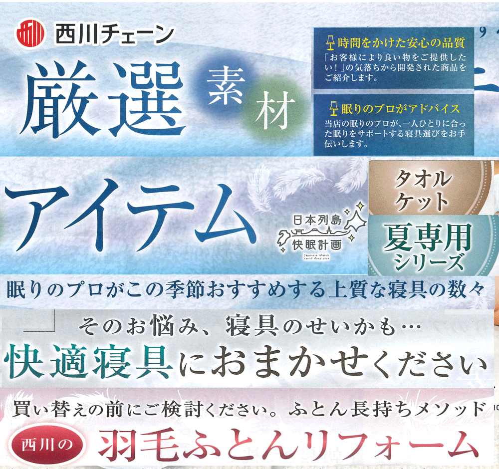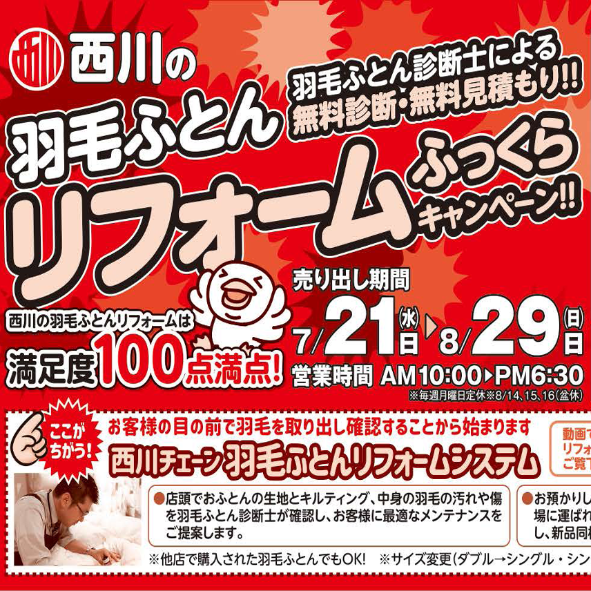 西川チェーン厳選「おススメ夏のアイテム&羽毛ふとんリフォームセール」 5月30日迄