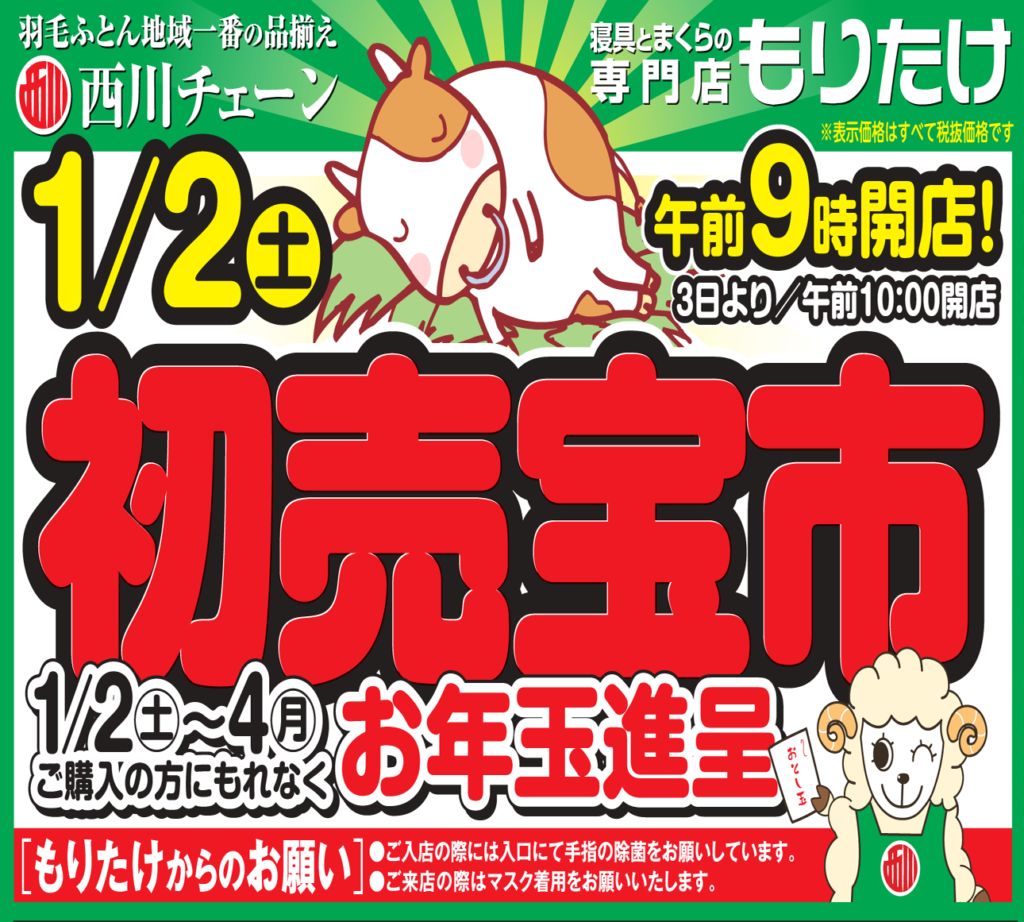 あけましておめでとうございます。もりたけの初売りは正月2日午前9時開店です!