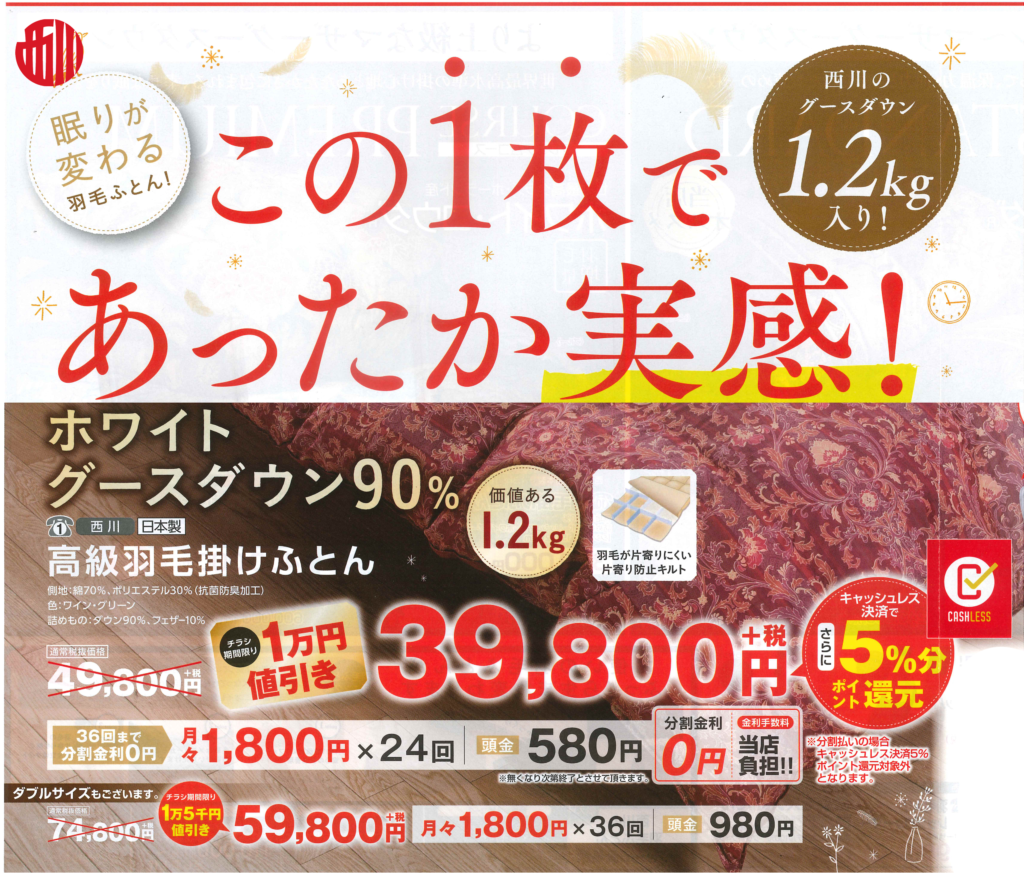 「西川羽毛ふとん・この1枚であったか実感!グースダウン特集」セール開催です。 セール期間 11月8日(金)~11月30日(土)