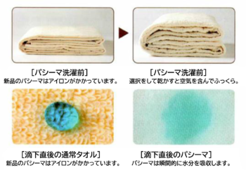 パシーマの繊維は、一般のタオルなどに比べて長いのが特徴。毛羽立ちが最小限に抑えられホコリが出にくく、軽量。とても洗濯しやすいので清潔に使っていただけます。