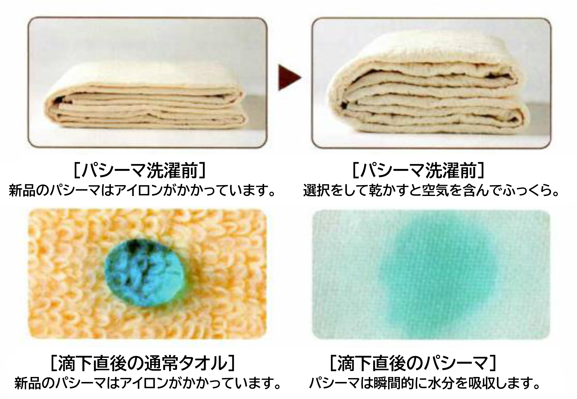 洗うほど中綿がふくれ、独自のしわが出てくると、ふわふわで柔らかな風合いになり、肌触りがどんどん良くなります。柔軟剤を使用しないことでずっと長持ち。パシーマ独自の構造により水分を瞬間的に吸収。汗もガスもパット吸収~放湿するので一年中快適。