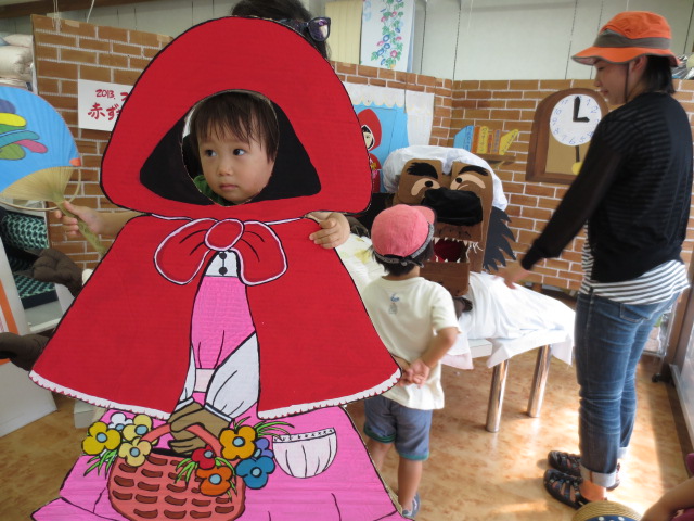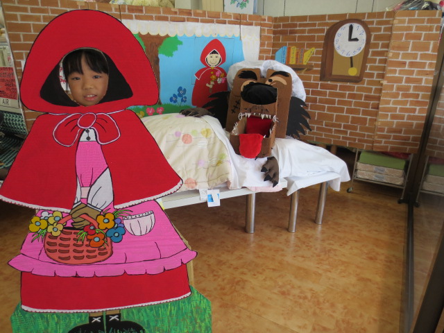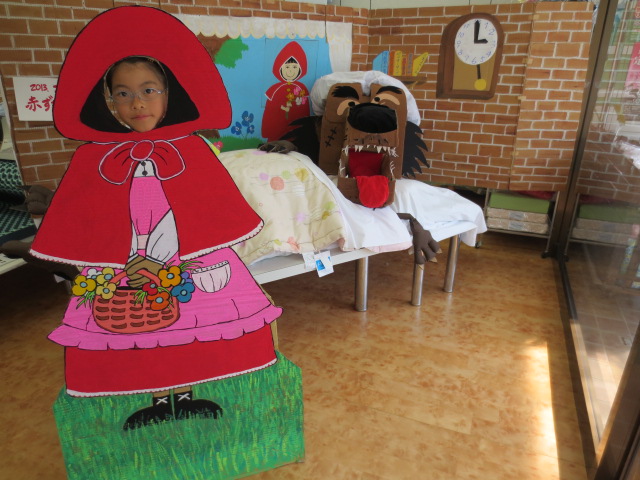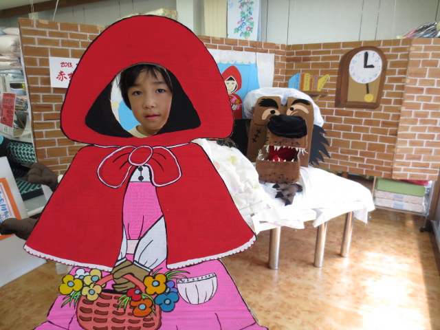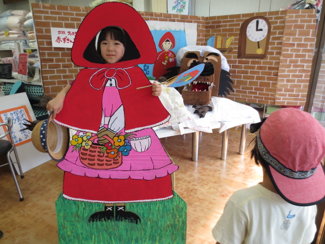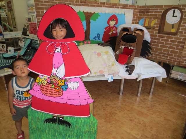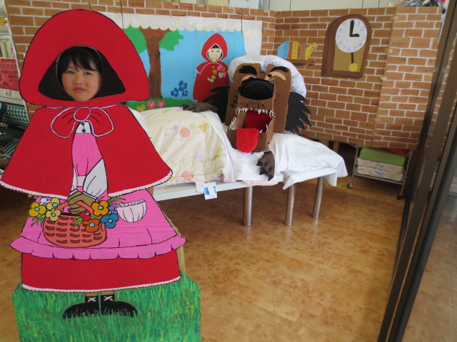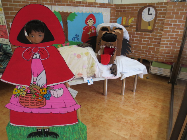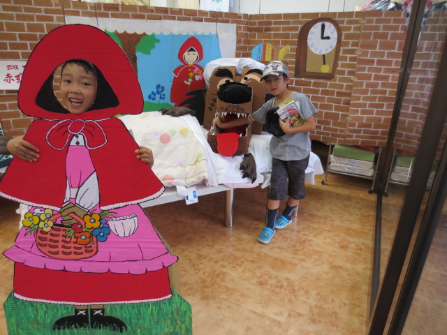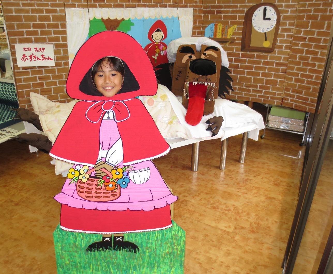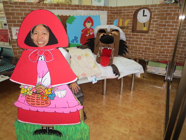 今年の当店のテーマは”赤ずきん” 大型のセットと顔出し赤ずきんでみんな笑顔で写真に収まっていただきました。