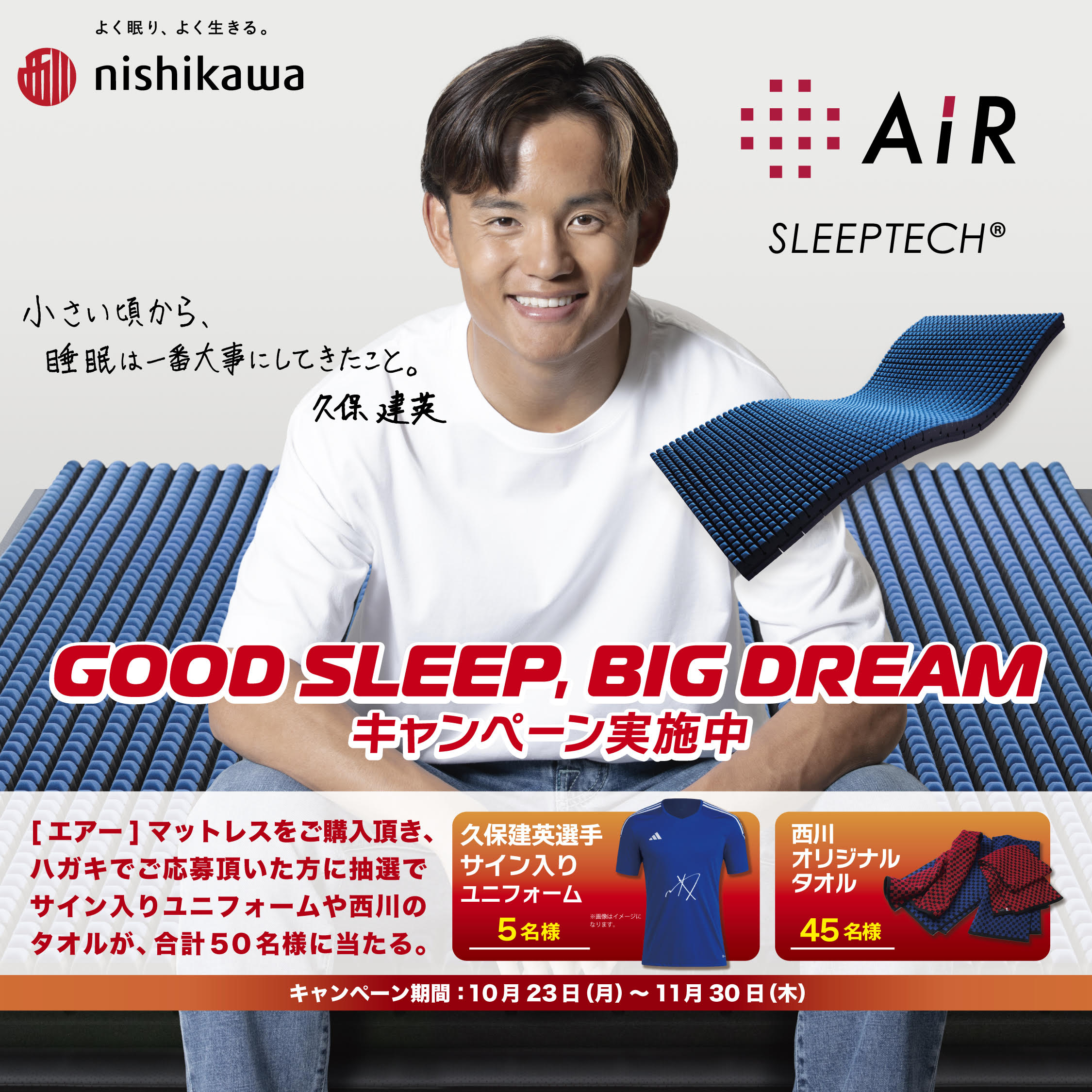 [エアー]マットレスご購入頂きハガキで応募頂いた方から抽選で#久保建英選手 直筆サイン入りユニフォームや西川のオリジナルタオルが合計50名様に当たる。※詳しくは店舗まで