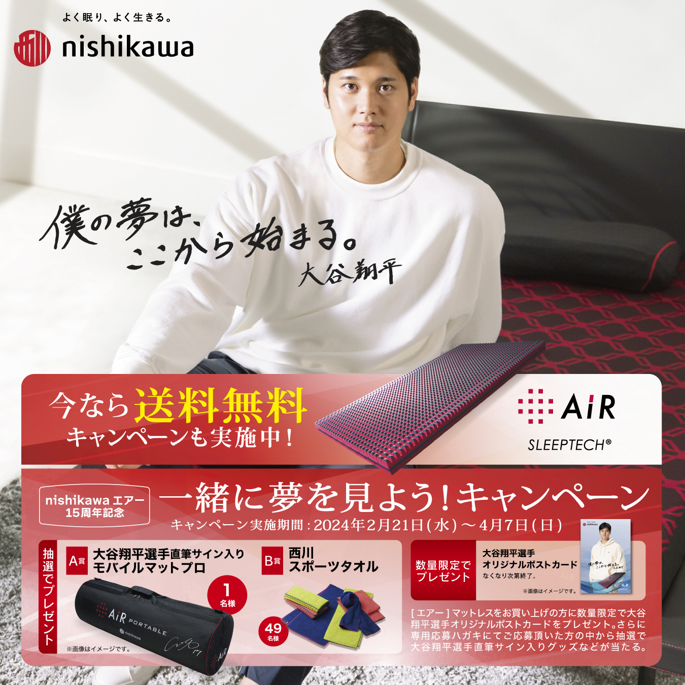 #一緒に夢を見よう! キャンペーン[期間]2月21日(水) ~4月7日(日)[エアー]マットレスご購入で#大谷翔平選手 オリジナルポストカードを数量限定でプレゼント!さらに、#大谷翔平選手 直筆サイン入りグッズまたはnishikawaグッズが抽選で当たる!※詳しくは店舗まで