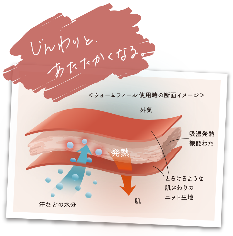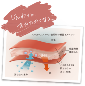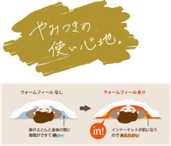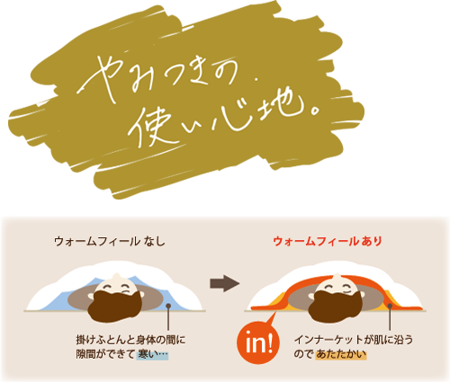 ウォームフィールは薄手でやわらかなニット素材を使用しています。羽毛ふとんと身体の間にすきまができず、肩口から熱が逃げるのを抑えるので、温かくお使いいただけます。