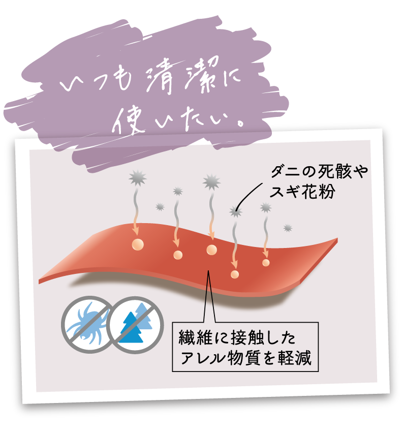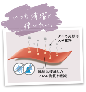 繊維に接触したハウスダスト(ダニの死骸・スギ花粉)に含まれるアレル物質を軽減する加工を施しています。