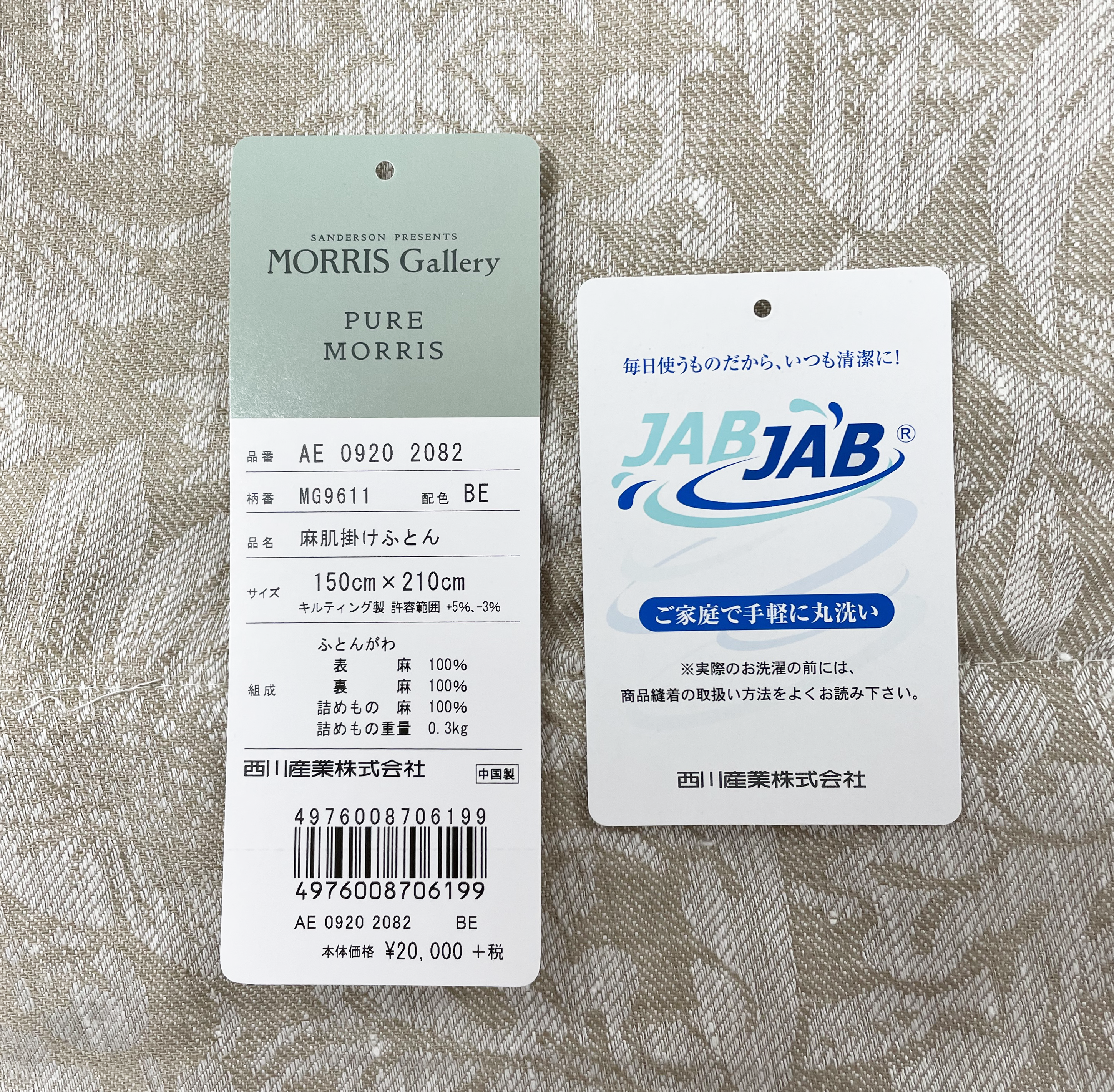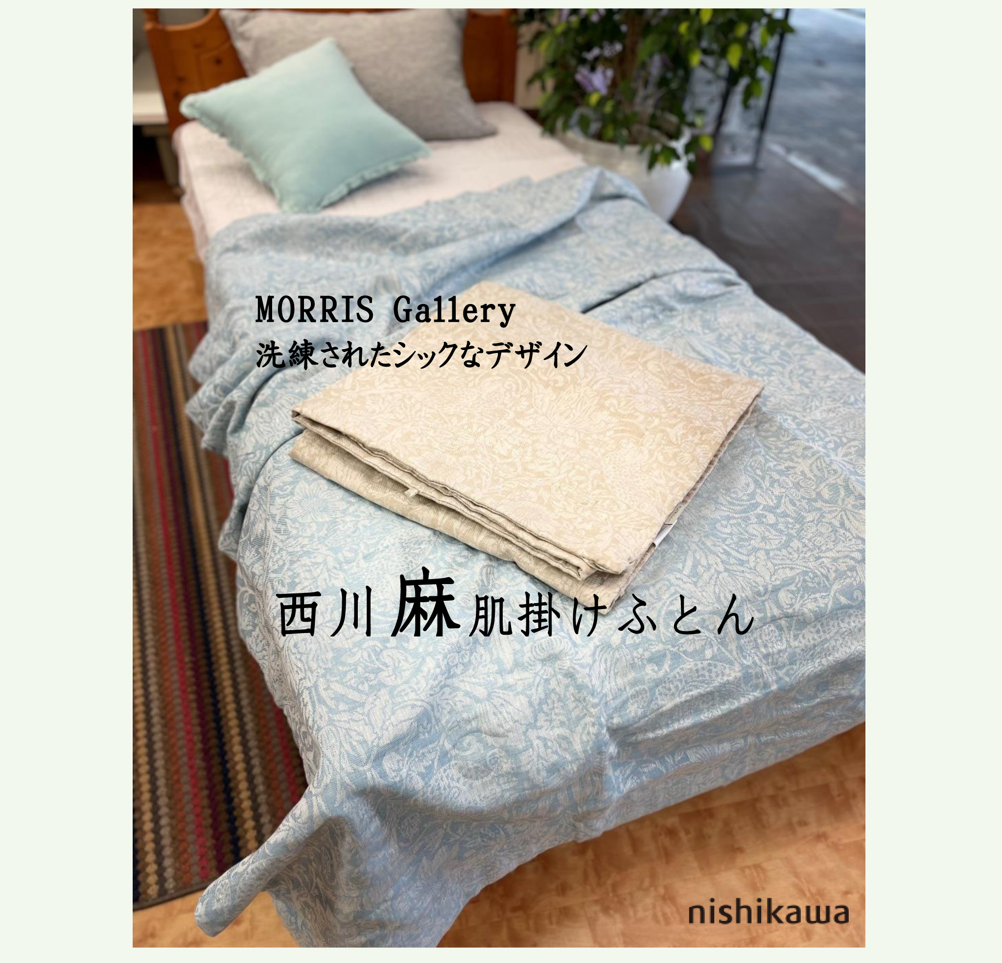 おふとんの柄は「モリスギャラリー(MORRIS Gallery)」の洗練されたシックなデザインで、先染め麻ジャガード生地を表裏に使用し、詰め物にも麻100%わたを使用しています。