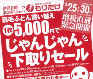 増税前・超お買い得セール開催!! 2014 3/04 セール・イベント 2014年3月4日 セール期間3/6(木)~3/30(日) 消費税増税前だからこそ寝具がお買い得!! 特に羽毛ふとんは、円安・原料高騰・増税のあおりで4月以降は大幅値上げ! 今がお買い時です! セール・イベント 増税前!羽毛ふとん買い替え1枚5,000円でじゃんじゃん下取りセール! 消費税増税 関連記事 もりたけの新春初売りは1月2日午前9時開店です! (※3日から4日までは午前10時開店) 2026年1月1日 もりたけ新春初売り 令和8年1月2日 午前9時開店! (※3日から4日までは午前10時開店) 2025年12月30日 年内臨時休業のお知らせ 12月22日(月)より12月31日まで 2025年12月21日 リニューアルオープン前の「歳末在庫一掃セール」 期間 12月13日(土)~21日(日) 2025年12月12日 あったか羽毛ふとん-テレフォンショッピングセール開催! 期間 11月8日(土)より12月14日(日) 2025年11月7日 改装中店舗の道向かいです。駐車場は店舗となりの[お客様🅿]または[市営地下🅿]をご利用ください。 2025年10月22日 臨時休業と仮店舗営業のご案内 ■臨時休業(改装店舗内整理のため) 期間:10月14日(火)より10月20日(月) 2025年10月15日 店舗リニューアル[完全閉店・在庫売り尽くしセール 第2弾] 期間 9月27日(土)~10月13日(日)まで 2025年9月26日