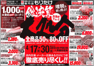 総決算大処分セール開催! 2014 4/16 セール・イベント 2014年4月16日 セール期間 4月16日(木)~30日(水) 毎年恒例の決算セール!! 全品50%~80%OFF 掘り出し物いっぱい!目玉品いっぱい! ご来店をお待ちしております! セール・イベント 桜吹雪の飯田です。 総決算大処分セール開催! 関連記事 もりたけの新春初売りは1月2日午前9時開店です! (※3日から4日までは午前10時開店) 2026年1月1日 もりたけ新春初売り 令和8年1月2日 午前9時開店! (※3日から4日までは午前10時開店) 2025年12月30日 年内臨時休業のお知らせ 12月22日(月)より12月31日まで 2025年12月21日 リニューアルオープン前の「歳末在庫一掃セール」 期間 12月13日(土)~21日(日) 2025年12月12日 あったか羽毛ふとん-テレフォンショッピングセール開催! 期間 11月8日(土)より12月14日(日) 2025年11月7日 改装中店舗の道向かいです。駐車場は店舗となりの[お客様🅿]または[市営地下🅿]をご利用ください。 2025年10月22日 臨時休業と仮店舗営業のご案内 ■臨時休業(改装店舗内整理のため) 期間:10月14日(火)より10月20日(月) 2025年10月15日 店舗リニューアル[完全閉店・在庫売り尽くしセール 第2弾] 期間 9月27日(土)~10月13日(日)まで 2025年9月26日