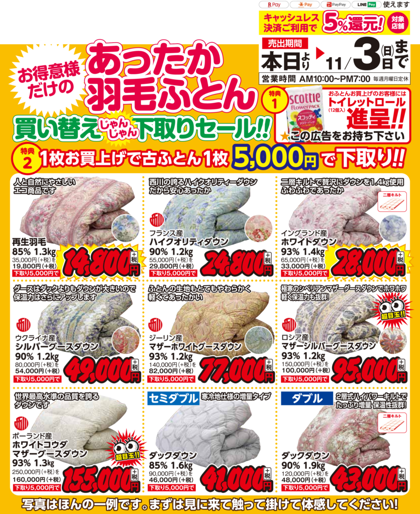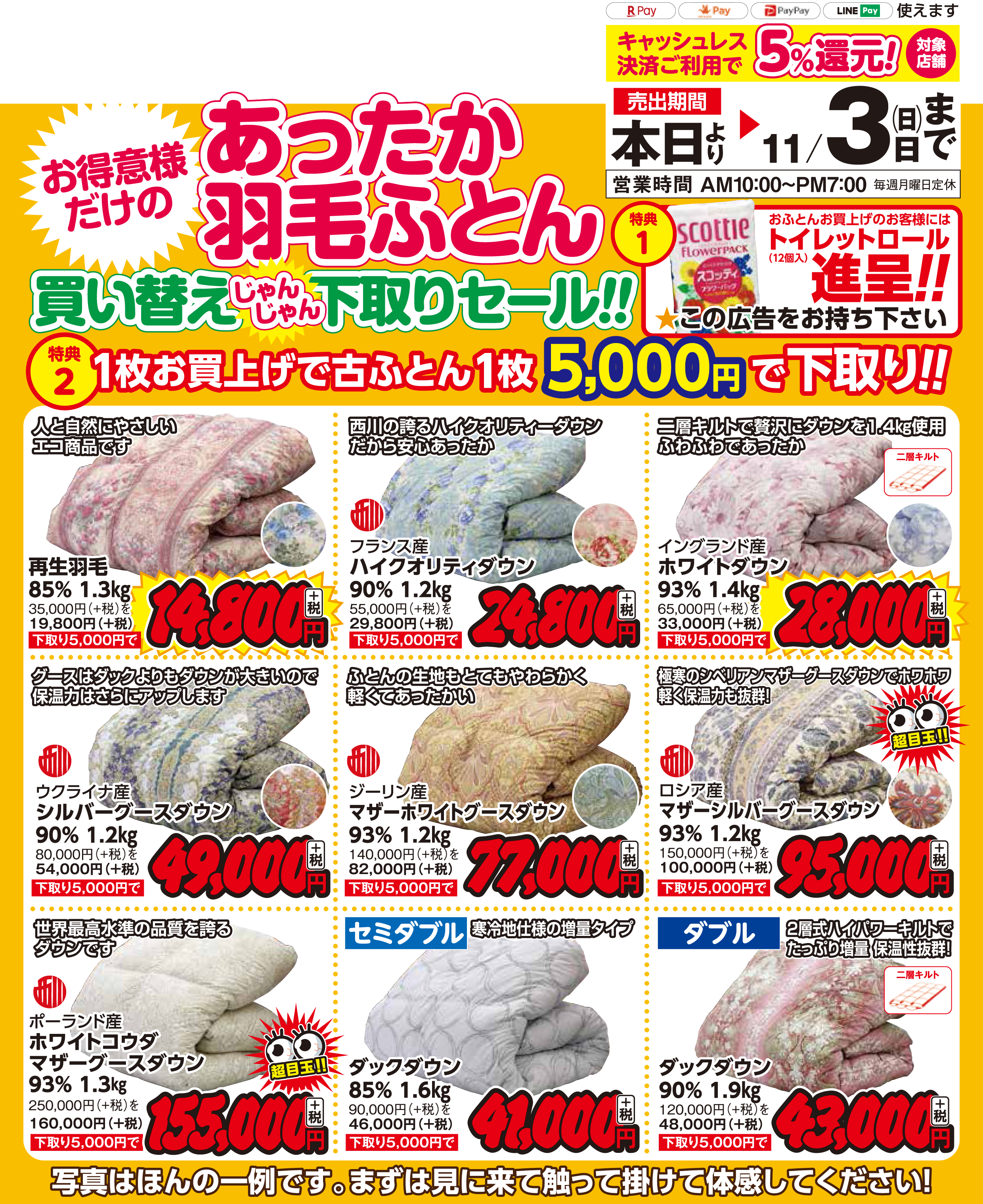 今回のセールでは羽毛布団をご購入されると、古布団を5,000円で下取りさせて頂きますので、セール価格よりさらに5,000円もお安くご購入いただけます(へへ)!