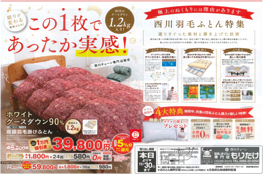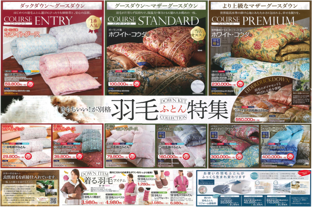 「西川チェーン店でのみ取り扱いが出来る東京西川製の羽毛ふとんですから安心です。