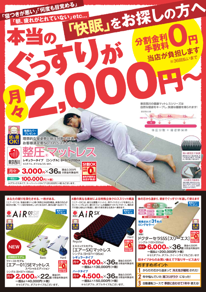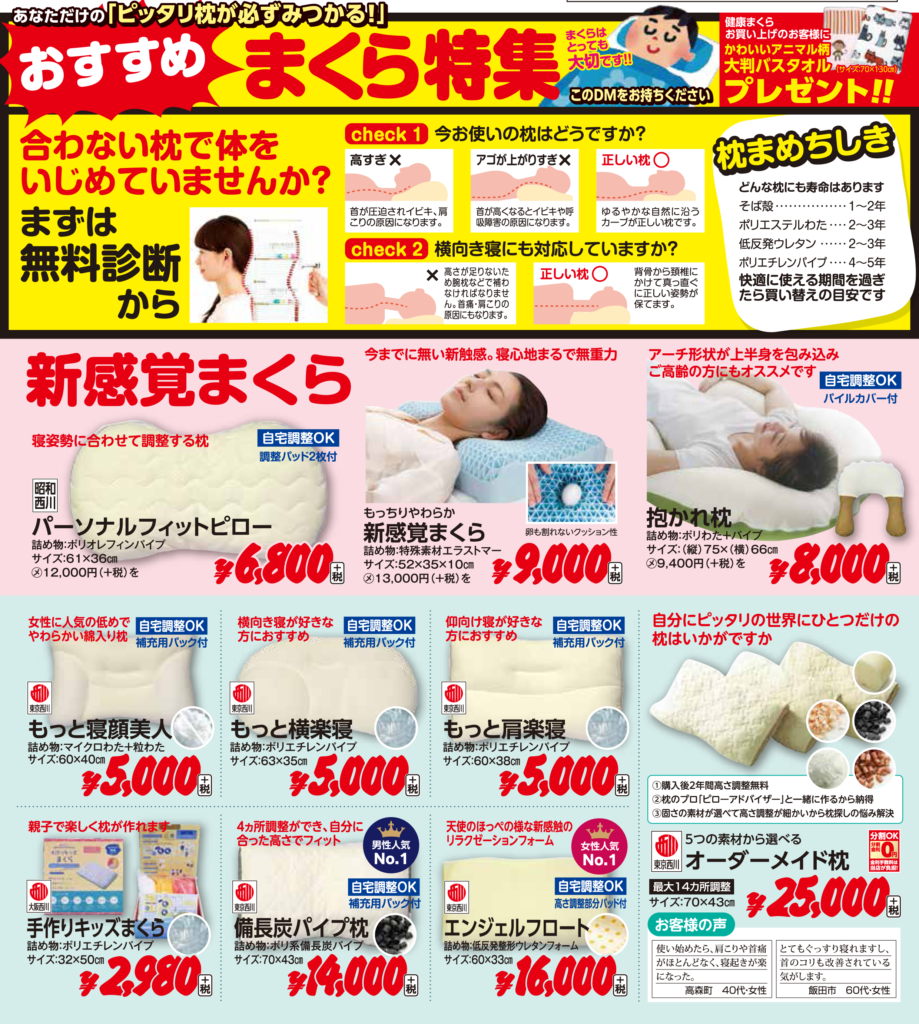 「枕と健康マット特集」開催中!! 健康で快適睡眠には枕と敷寝具が大切です!