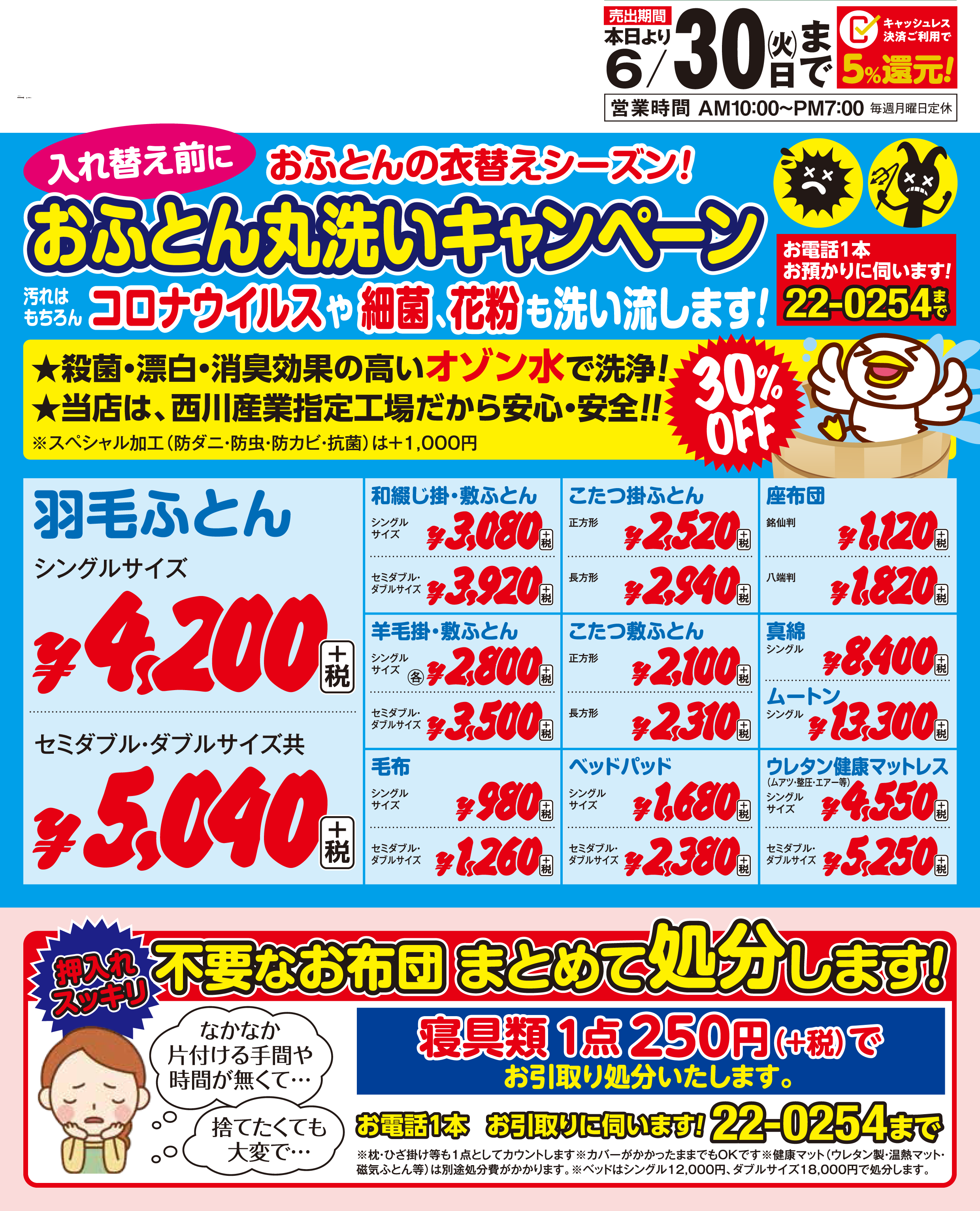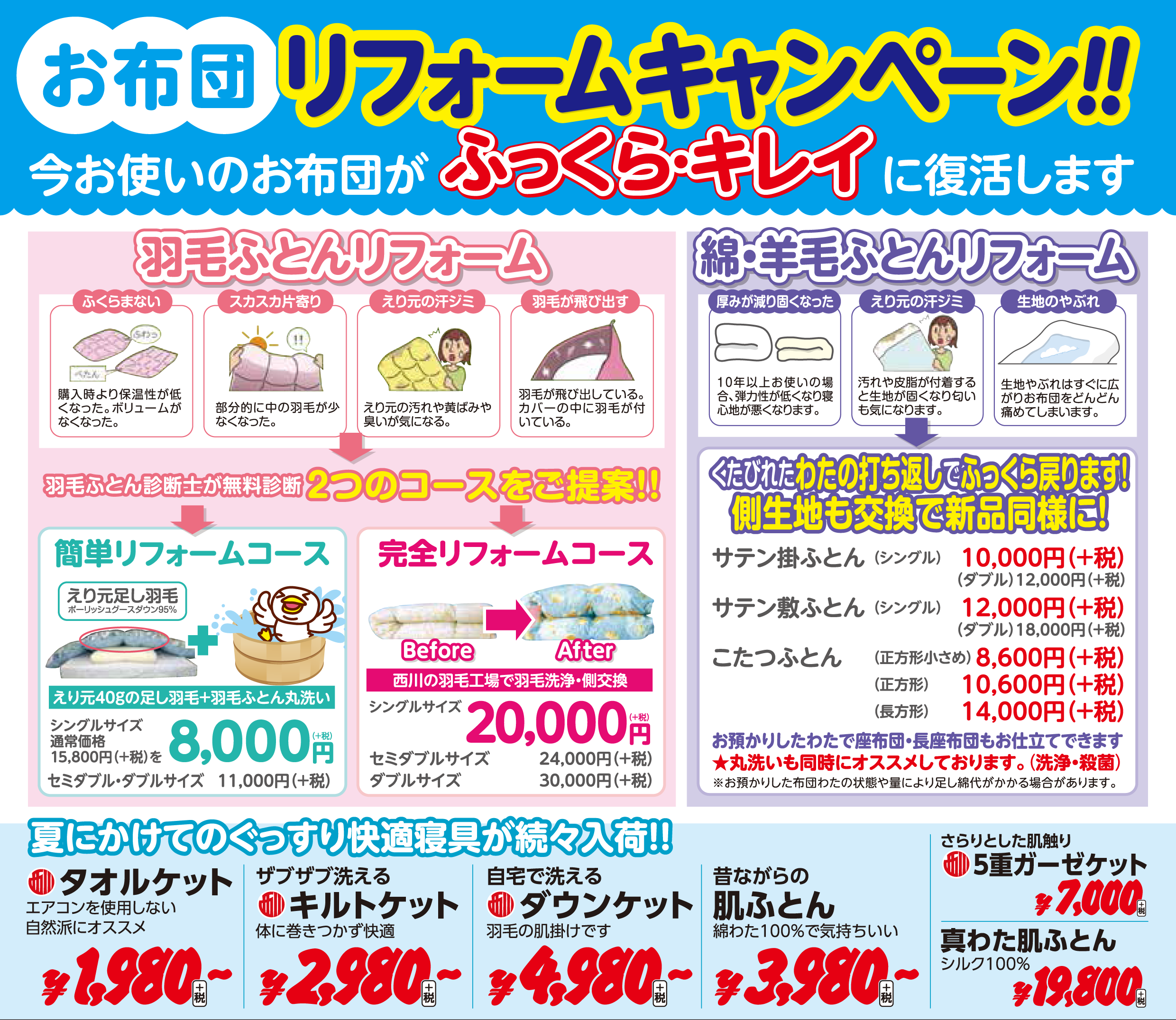 お布団入替の前に!お布団丸洗い&リフォームキャンペーン!!& 不要なお布団まとめて処分キャンペーン!開催中です