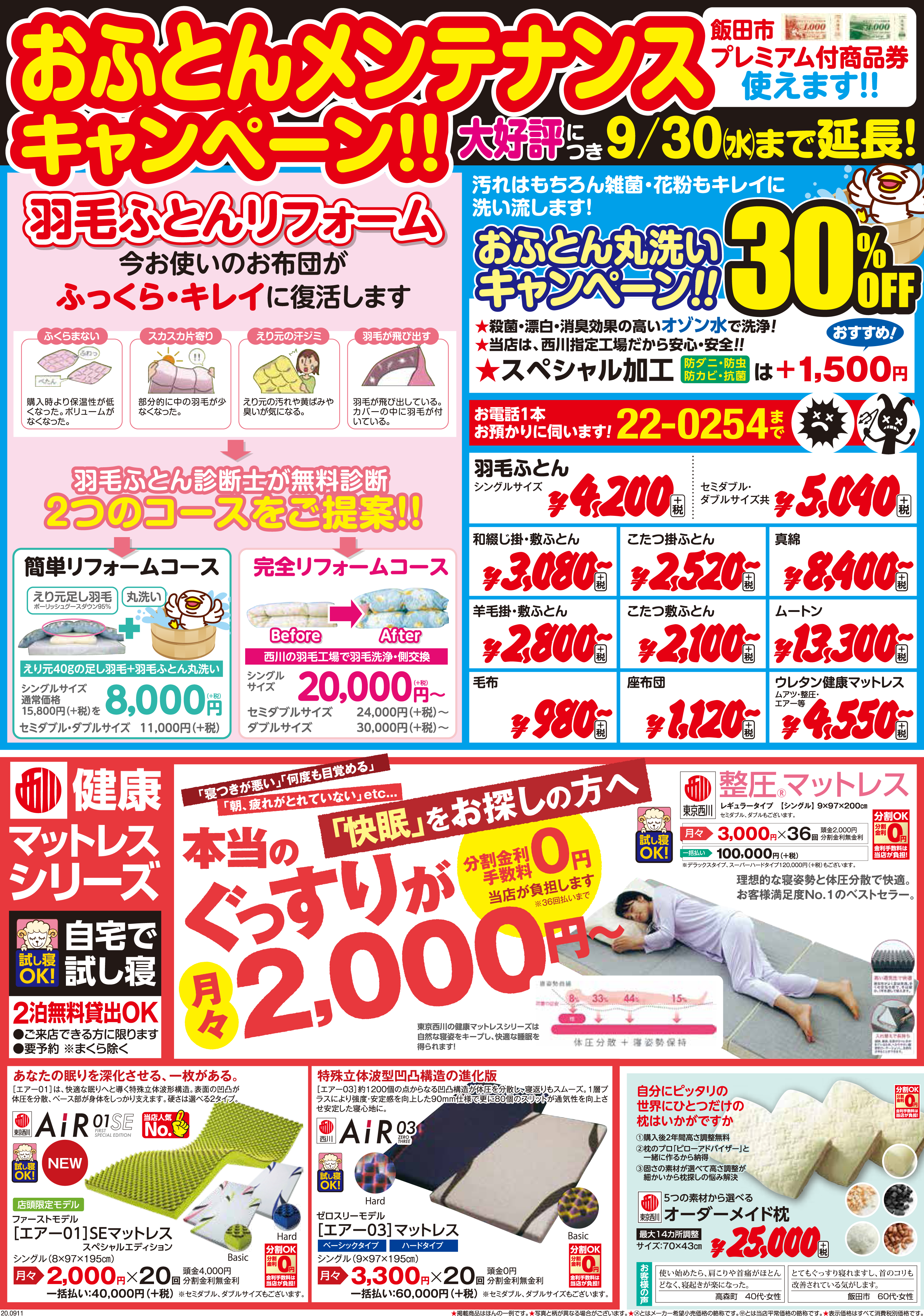 今年はお布団メンテナンスキャンペーンが大好評のため、9月30日まで延長しました!