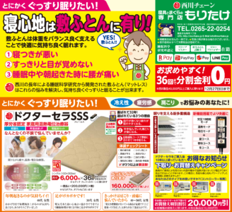 広告裏面では、とにかくぐっすり眠りたい!「寝心地は敷ふとんにあり!」と題して、西川の健康を科学した敷布団「ドクターセラ」をご紹介しております。