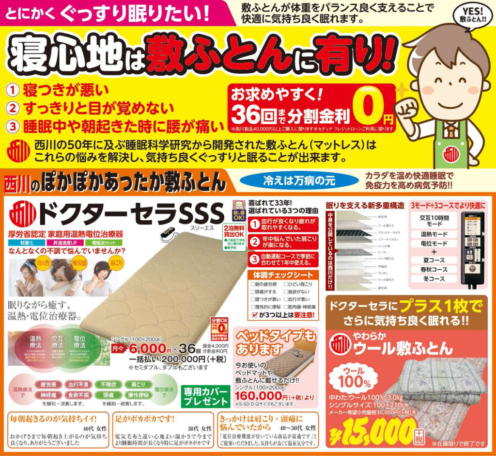 裏面掲載の[ 西川のぽかぽかあったか敷ふとん ドクターセラSSS ]も好評をいただいております。
