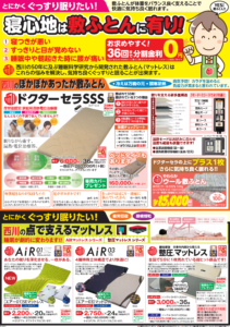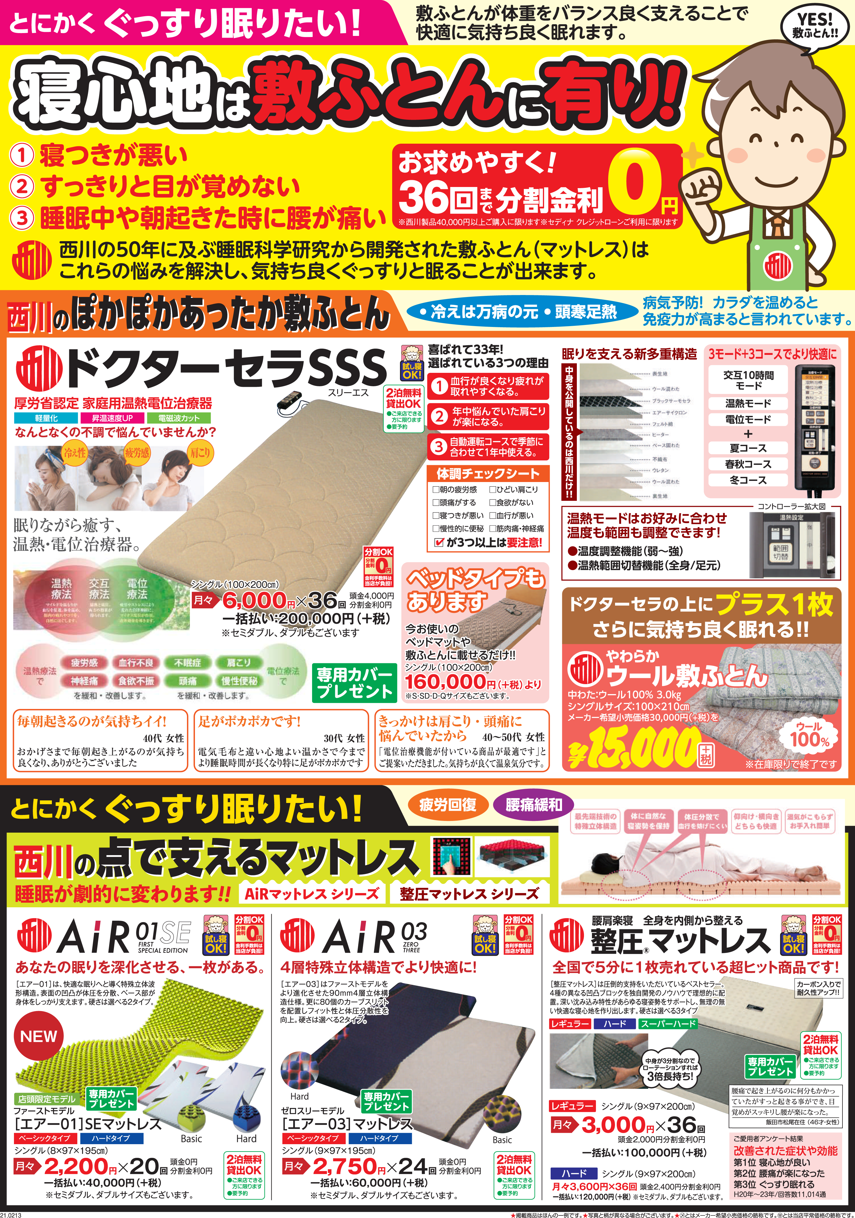 広告裏面は西川の健康寝具を掲載。大人気のAiRシリーズ、整圧マットレスシリーズ、そしてドクターセラSSSは昨年10月から例年にも増してご購入されるお客様が増えています。