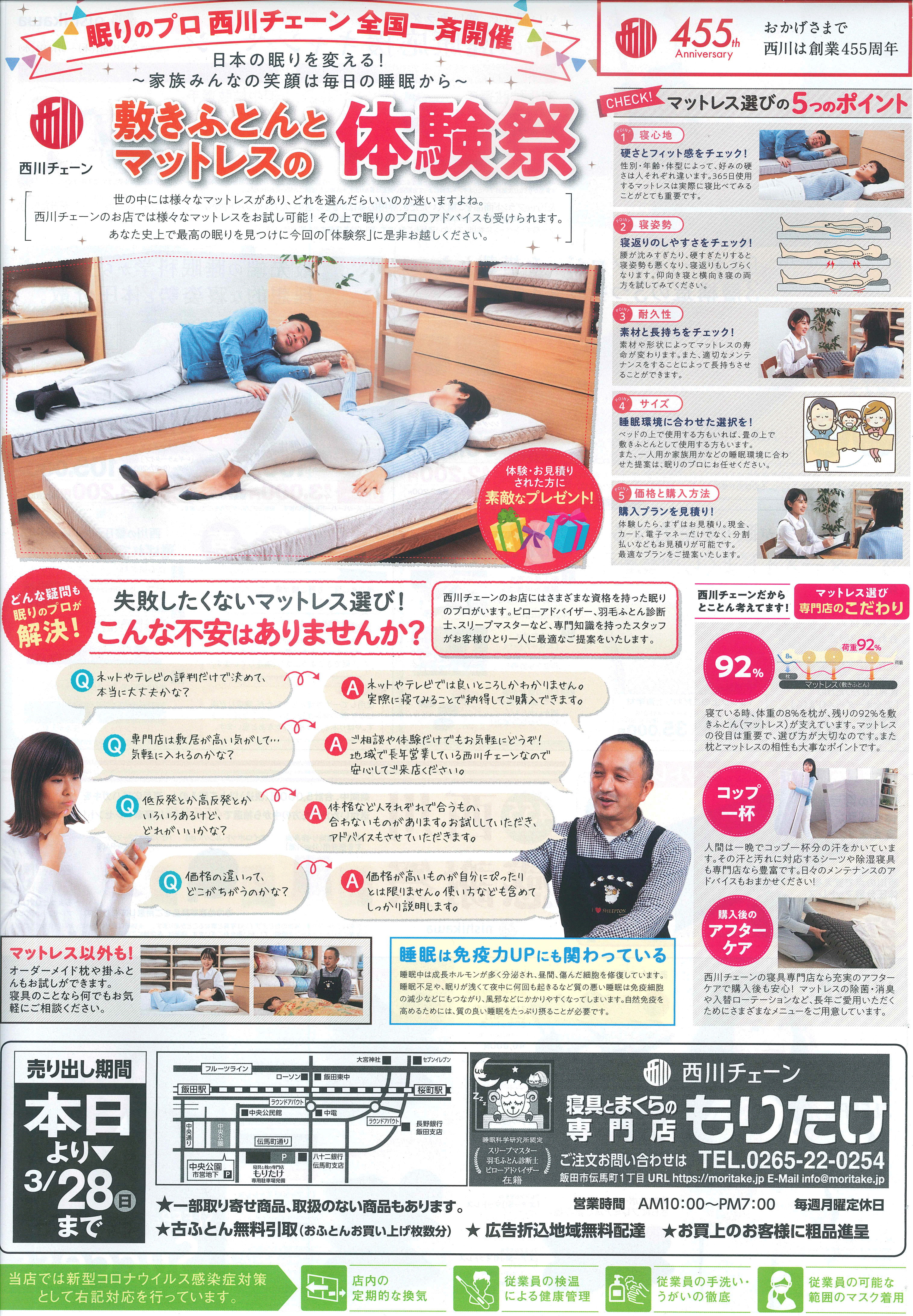 また、今年は当店取引先の西川㈱の創業455年記念の年でもあり、試し寝をしていただくだけで粗品のプレゼントもご用意しております。