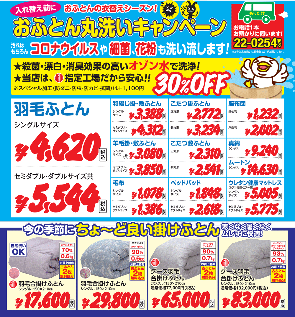 もりたけでは西川指定の丸洗い工場でお洗濯します。気持ちよくふっくら仕上がります。