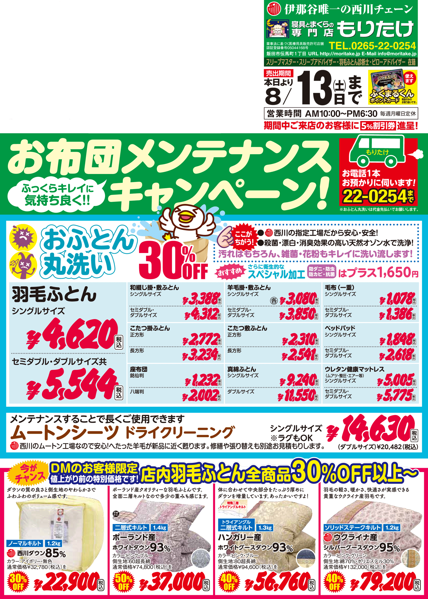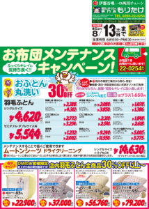 「おふとんのメンテナンスキャンペーン」を好評につき期間延長で8月13日まで特典付きで開催します。