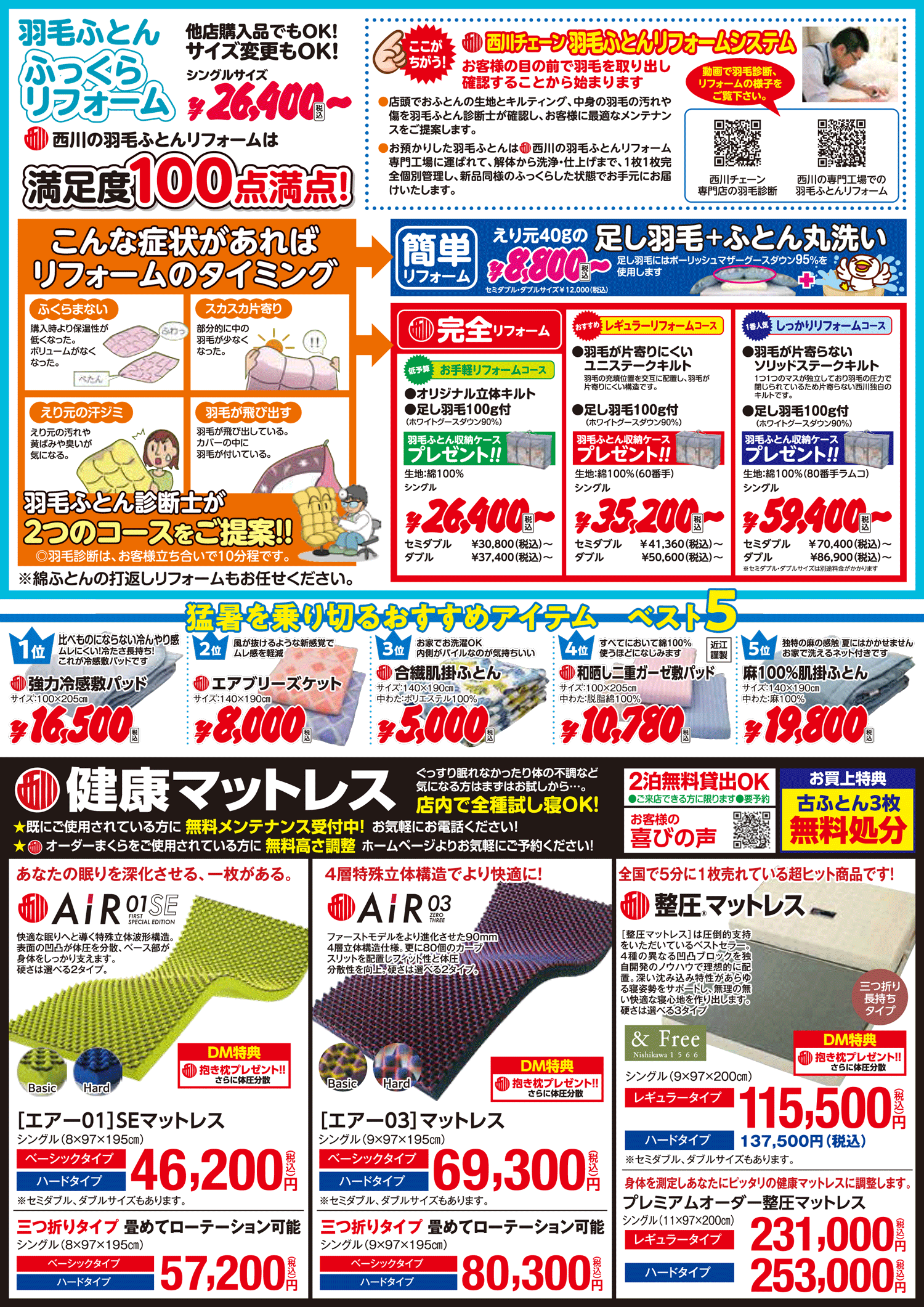 ◎今回のDMでは、DMをお持ちいただいたお客様、または「ネットで見たよ!」のお客様に、専門店おススメの羽毛ふとんや”夏を乗り切るこだわり寝具ベスト5“がDM特別価格(店頭表示価格よりも更にお値打ち)でご購入できます。