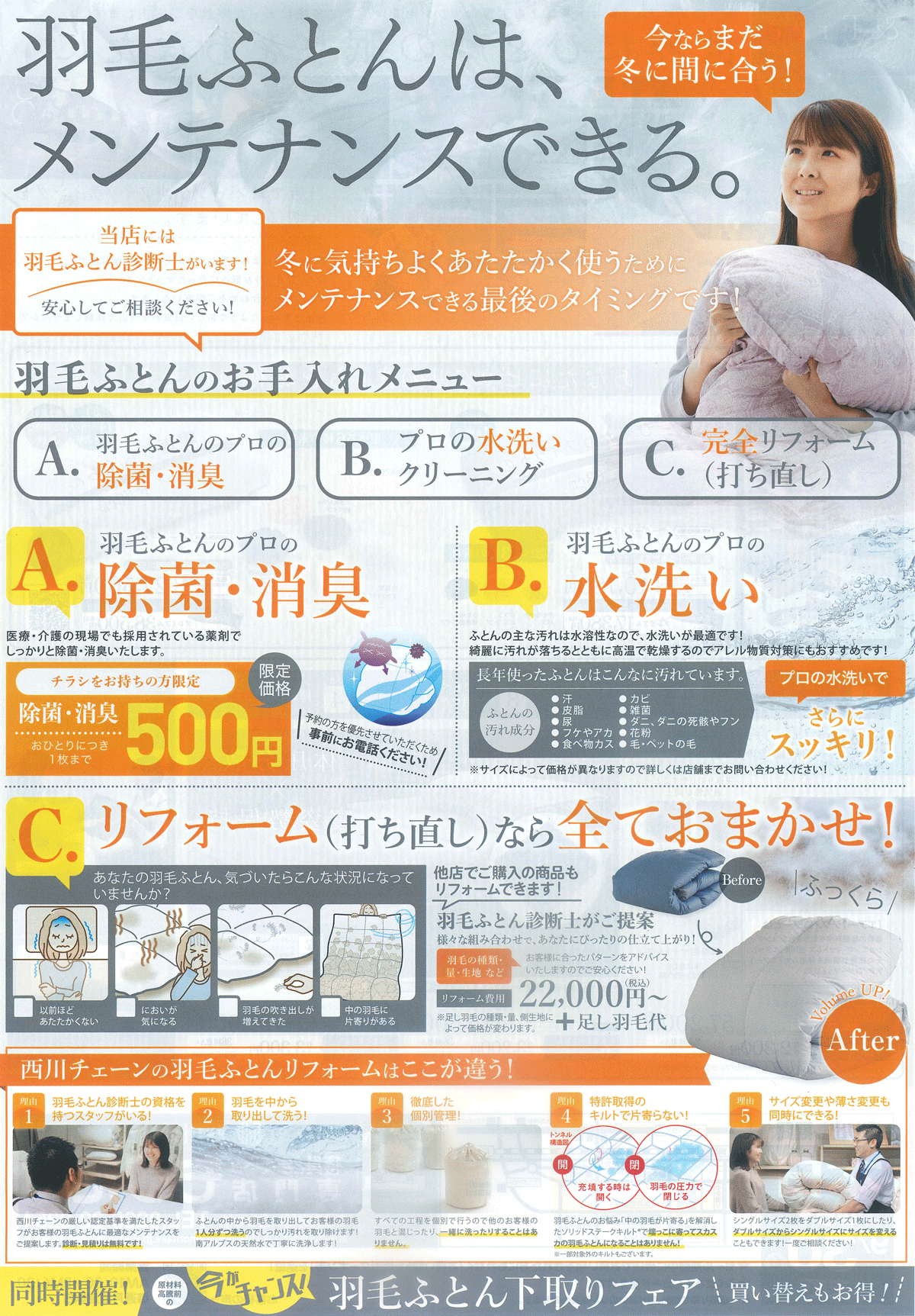 「羽毛ふとんはメンテナンスできる!今ならまだ冬に間に合う!!」キャンペーン開催。 9月30日(金)まで