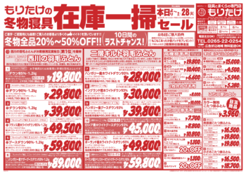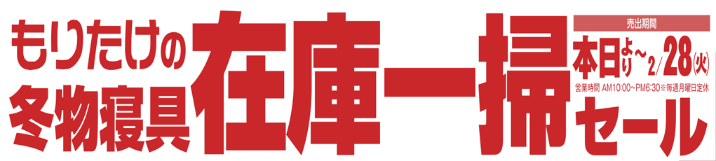 もりたけの「冬物寝具在庫一掃セール第2弾」開催です! 冬物全品20~50%OFF!! セール期間2/18(土)~2/28(水) 今後値上がり予定商品など今が買い時です。この機会にぜひ買換え・買い足しをご検討ください。