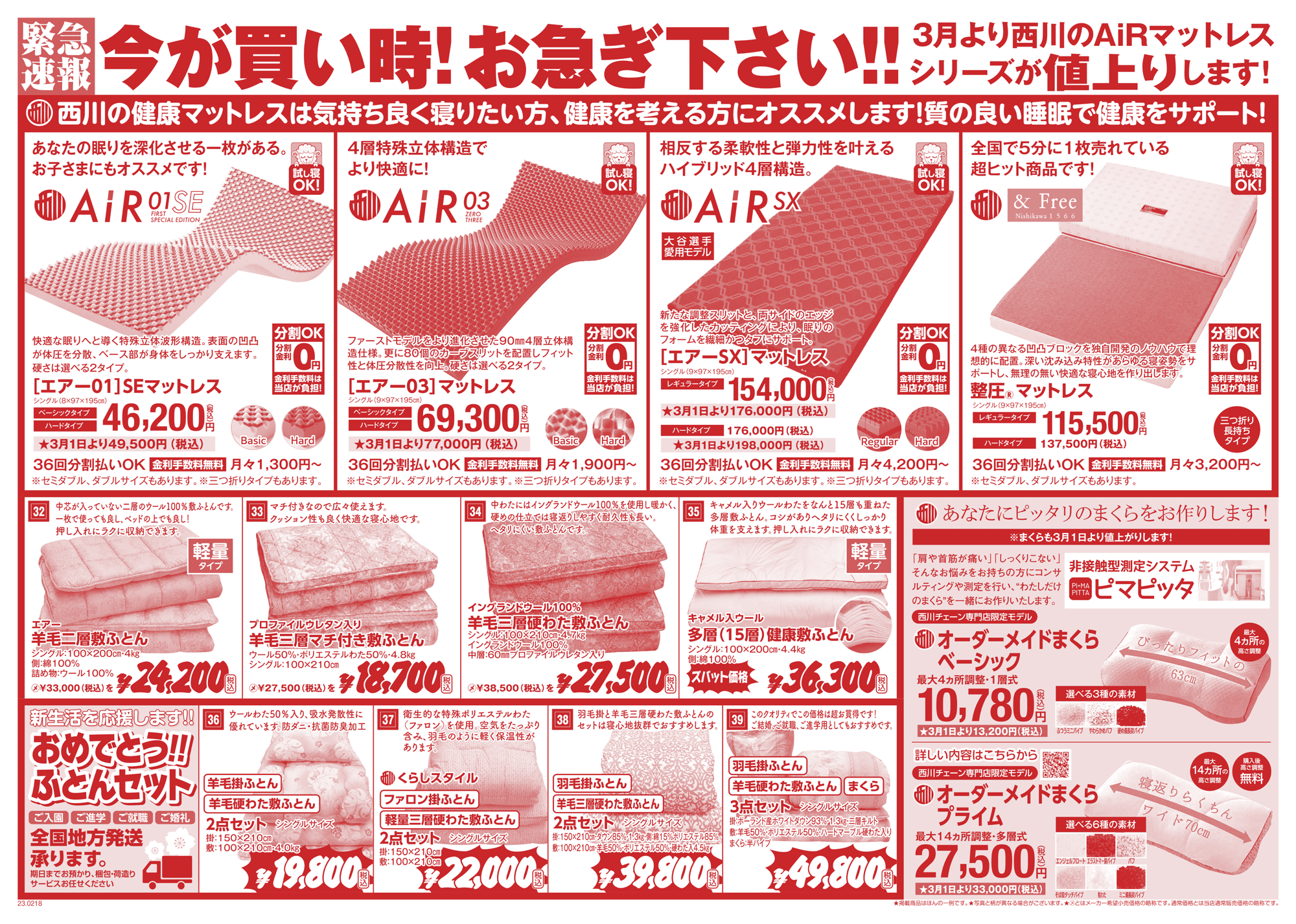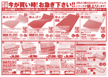 また西川の健康マットレスシリーズは3月1日より値上げが決定しています。ご購入をお考えの方は今が買い時です。