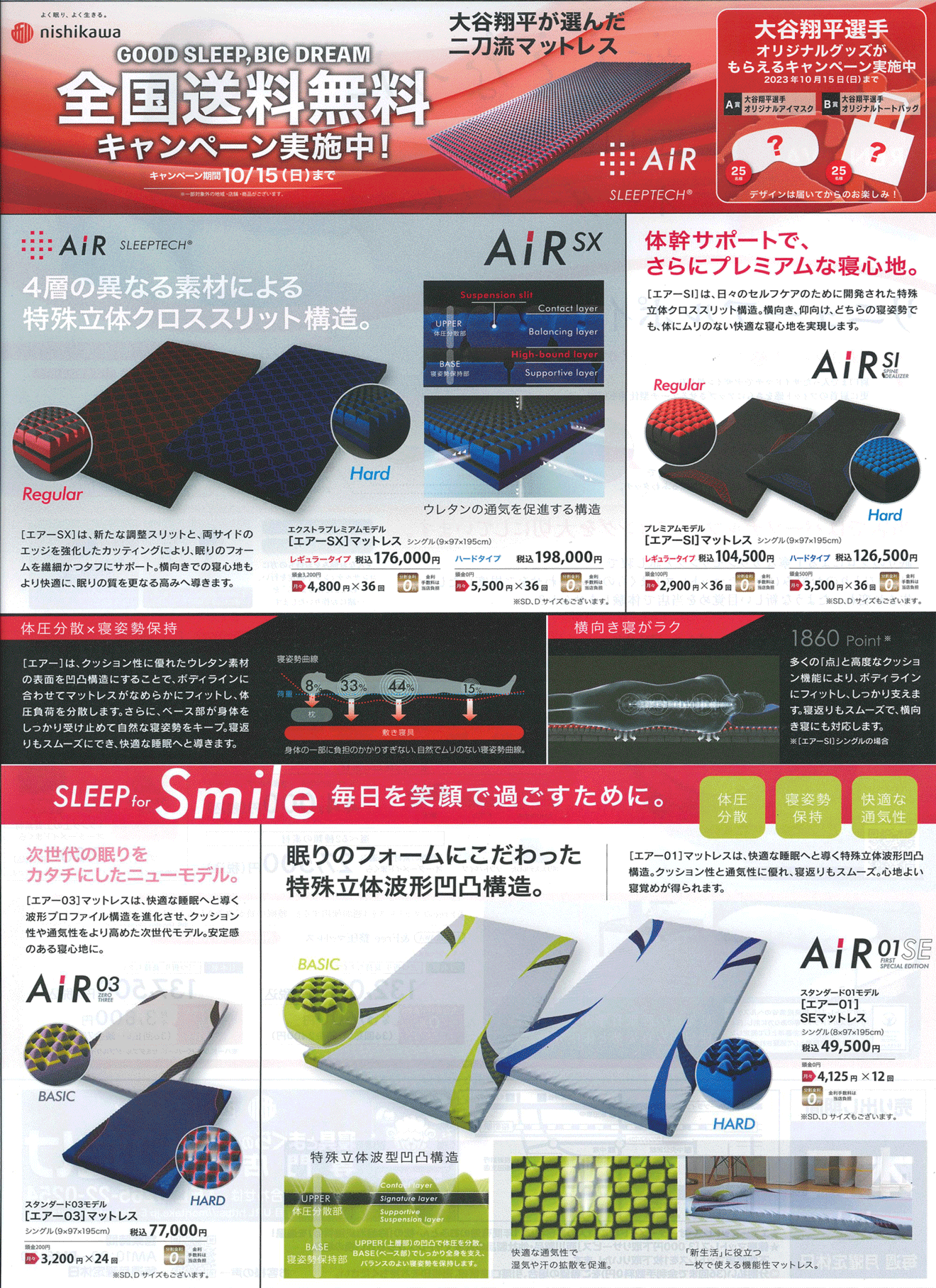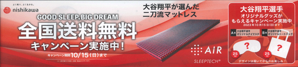 あの大谷選手も使用している健康マットレス”西川AiR”の全国無料配送キャンペーン開催中です。
