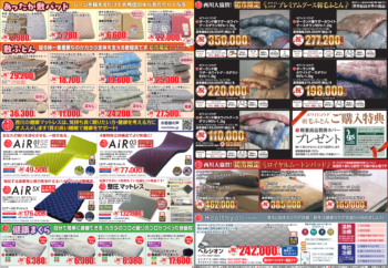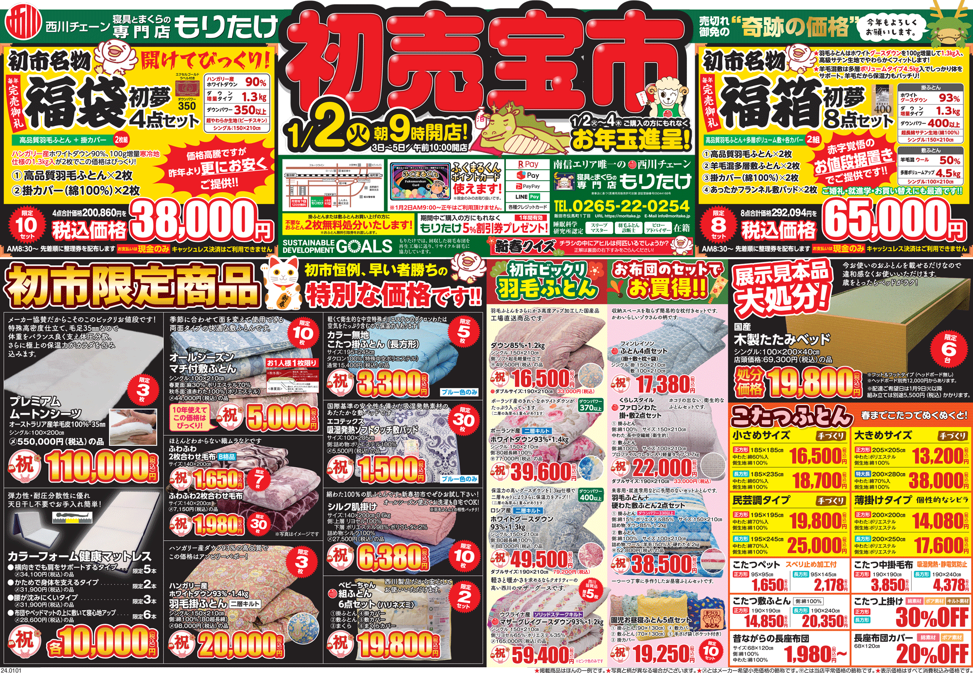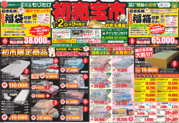 今年も福袋(限定10個)、 福箱(限定8個)を販売いたします。高品質寝具が特別価格となっております。 毎年完売となりますのでご希望の方は早めにお越しください! ※1/2、午前8時30分より整理券を配布します。