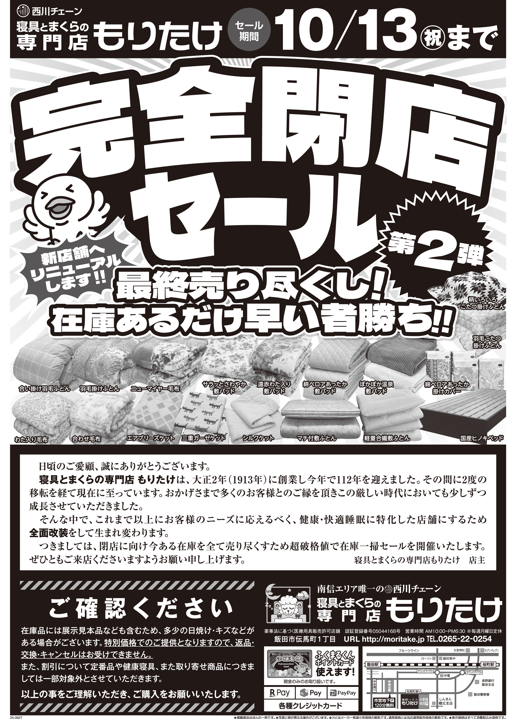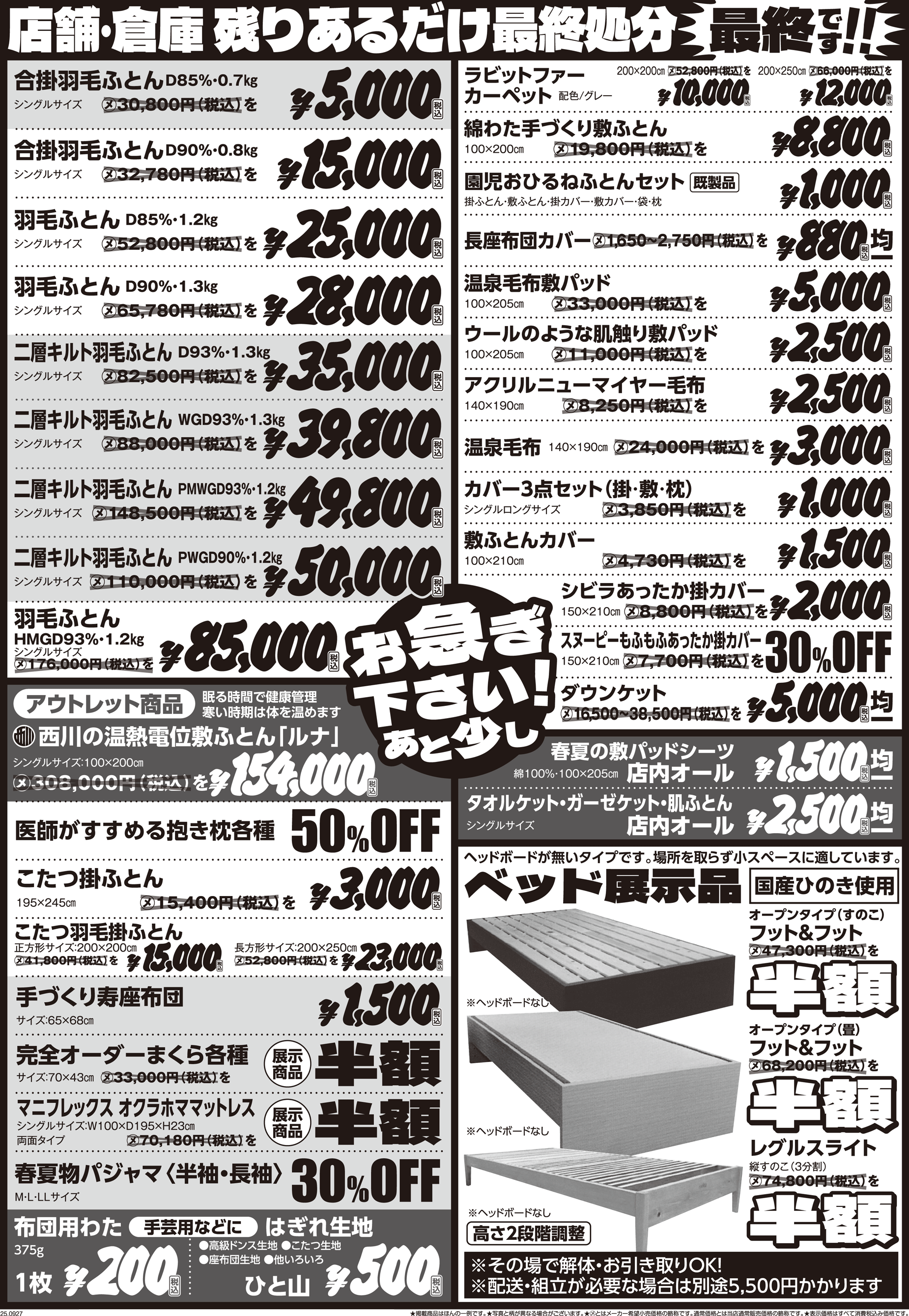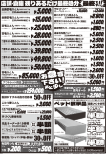 全て閉店特別価格で大放出いたします。冬に備えて羽毛布団などのあったか寝具も含めお値打ち価格になっておりますので、この機会をお見逃しなくぜひお越しください!